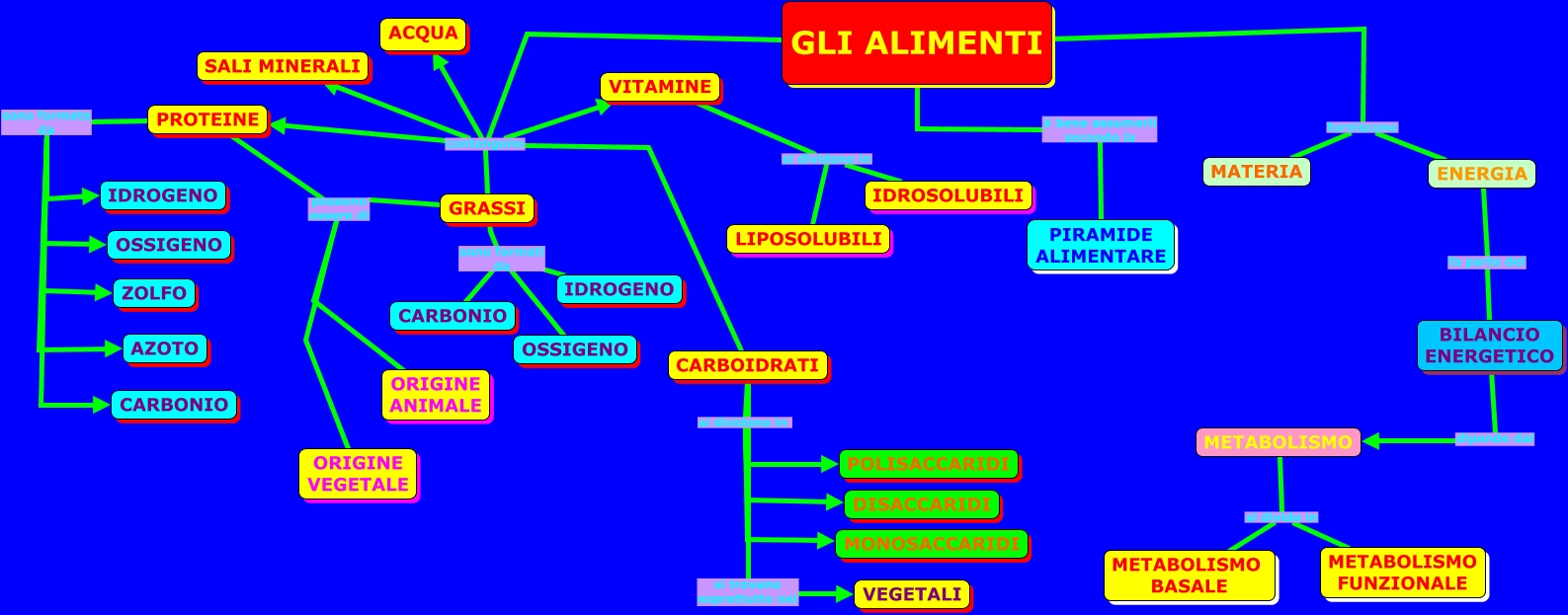 Questa Cmap, creata con IHMC CmapTools, contiene informazioni relative a: GLI ALIMENTI (1).cmap, CARBOIDRATI si dividono in DISACCARIDI, GLI ALIMENTI è bene assumerli secondo la PIRAMIDE ALIMENTARE, GRASSI sono formati da OSSIGENO, METABOLISMO si divide in METABOLISMO BASALE, GLI ALIMENTI forniscono ENERGIA, PROTEINE sono formate da AZOTO, GLI ALIMENTI contengono PROTEINE, ENERGIA fa parte del BILANCIO ENERGETICO, GLI ALIMENTI contengono VITAMINE, GLI ALIMENTI forniscono MATERIA, GLI ALIMENTI contengono GRASSI, METABOLISMO si divide in METABOLISMO FUNZIONALE, VITAMINE si dividono in IDROSOLUBILI, GLI ALIMENTI contengono SALI MINERALI, PROTEINE possono essere di ORIGINE ANIMALE, PROTEINE possono essere di ORIGINE VEGETALE, GRASSI sono formati da CARBONIO, PROTEINE sono formate da OSSIGENO, GRASSI possono essere di ORIGINE ANIMALE, VITAMINE si dividono in LIPOSOLUBILI