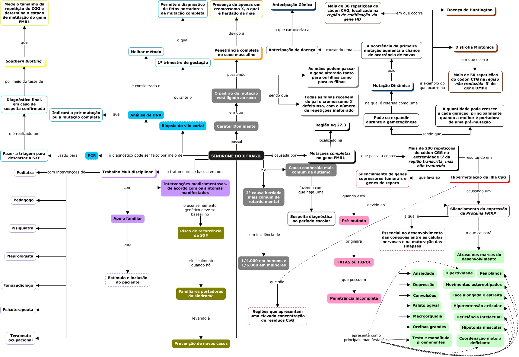 Esse mapa conceitual, produzido no IHMC CmapTools, tem a informação relacionada a: Síndrome do X Frágil, Mutações completas no gene FMR1 localizado na Região Xq 27.3, Mais de 200 repetições do códon CGG na extremidade 5' da região transcrita, mas não traduzida resultando em Hipermetilação da ilha CpG, Hipermetilação da ilha CpG que leva ao Silenciamento de genes supressores tumorais e genes de reparo, Biópsia do vilo corial durante o 1º trimestre de gestação, FXTAS ou FXPOI que possuem Penetrância incompleta, SÍNDROME DO X FRÁGIL apresenta como principais manifestações Ansiedade, Análise de DNA que Indicará a pré-mutação ou a mutação completa, Pode se expandir durante a gametogênese na qual é referida como uma Mutação Dinâmica, SÍNDROME DO X FRÁGIL o diagnóstico pode ser feito por meio de PCR, Caráter Dominante em que O padrão da mutação está ligado ao sexo, Trabalho Multidisciplinar com intervenções de Pedagogo, Familiares portadores da síndrome levando à Prevenção de novos casos, SÍNDROME DO X FRÁGIL apresenta como principais manifestações Hipotonia muscular, 2ª causa herdada mais comum de retardo mental com incidência de 1/4.000 em homens e 1/6.000 em mulheres, Análise de DNA é considerado o Melhor método, Trabalho Multidisciplinar com intervenções de Pediatra, Trabalho Multidisciplinar com intervenções de Neurologista, O padrão da mutação está ligado ao sexo sendo que As mães podem passar o gene alterado tanto para os filhos como para as filhas, Distrofia Miotônica em que ocorre Mais de 50 repetições do códon CTG na região não traduzida 3' do gene DMPK, SÍNDROME DO X FRÁGIL possui Caráter Dominante