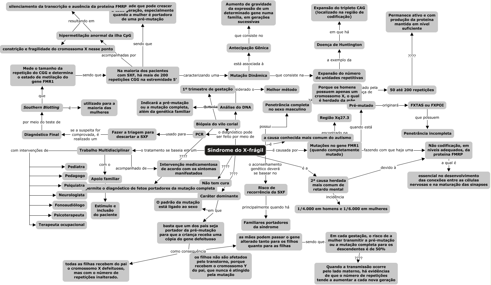 Esse mapa conceitual, produzido no IHMC CmapTools, tem a informação relacionada a: Síndrome do X-frágil, Mutações no gene FMR1 (quando completamente mutado) quando está Pré-mutado, Mede o tamanho da repetição do CGG e determina o estado de metilação do gene FMR1 sendo que Na maioria dos pacientes com SXF, há mais de 200 repetições CGG na estremidade 5', Biópsia do vilo corial durante o 1º trimestre de gestação, Síndrome do X-frágil o diagnóstico pode ser feito por meio de PCR, Síndrome do X-frágil o aconselhamento genético deverá se basear no Risco de recorrência da SXF, Southern Blotting é utilizado para a maioria das mulheres, Trabalho Multidisciplinar com intervenções de Neurologista, Antecipação Gênica que consiste no Aumento de gravidade da expressão de um determinado gene numa família, em gerações sucessivas, Na maioria dos pacientes com SXF, há mais de 200 repetições CGG na estremidade 5' sendo que quantidade que pode crescer a cada geração, especialmente quando a mulher é portadora de uma pré-mutação, Trabalho Multidisciplinar com intervenções de Fonoaudiólogo, basta que um dos pais seja portador da pré-mutação para que a criança receba uma cópia do gene defeituoso como consequência todas as filhas recebem do pai o cromossomo X defeituoso, mas com o número de repetições inalterado., Mutação Dinâmica que consiste na Expansão do número de unidades repetitivas, Análise do DNA sendo considerado o Melhor método, Na maioria dos pacientes com SXF, há mais de 200 repetições CGG na estremidade 5' caracterizando uma Mutação Dinâmica, Síndrome do X-frágil é a causa conhecida mais comum do autismo, Caráter dominante em que O padrão da mutação está ligado ao sexo, Síndrome do X-frágil é a 2ª causa herdada mais comum de retardo mental, Trabalho Multidisciplinar com intervenções de Pediatra, Síndrome do X-frágil ???? Caráter dominante, Trabalho Multidisciplinar com o Apoio familiar