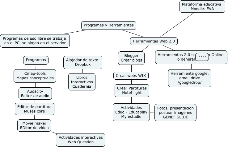 Este Cmap, tiene información relacionada con: Programas y Herramientas, Programas de uso libre se trabaja en el PC, se alojan en el servidor ???? Audacity Editor de audio, Herramientas Web 2.0 ???? Plataforma educativa Moodle. EVA, Alojador de texto Dropbox ???? Libros Interactivos Cuadernía, Programas y Herramientas ???? Programas de uso libre se trabaja en el PC, se alojan en el servidor, Movie maker EDitor de video ???? Actividades interactivas Web Question, Herramientas Web 2.0 ???? ????, Herramientas 2.0 se trabaja Online o generan URL ???? Herramienta google, gmail drive /googledrop/, Herramientas Web 2.0 ???? ????, Blogger Crear blogs ???? Actividades Educ - Educaplay My estudio, Actividades Educ - Educaplay My estudio ???? Fotos, presentacion postear imagenes GENEF SLIDE, Programas y Herramientas ???? Herramientas Web 2.0, Programas ???? Movie maker EDitor de video