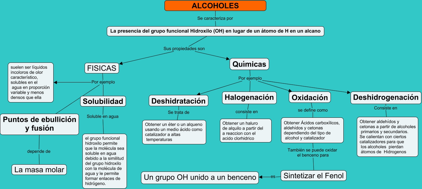 Este Cmap, tiene información relacionada con: Aprendizaje-Teorías, Puntos de ebullición y fusión depende de La masa molar, Químicas Por ejemplo Deshidrogenación, Químicas Por ejemplo Halogenación, Sintetizar el Fenol es Un grupo OH unido a un benceno, Oxidación se define como Obtener Ácidos carboxílicos, aldehídos y cetonas dependiendo del tipo de alcohol y catalizador, Obtener Ácidos carboxílicos, aldehídos y cetonas dependiendo del tipo de alcohol y catalizador También se puede oxidar el benceno para Sintetizar el Fenol, ALCOHOLES Se caracteriza por La presencia del grupo funcional Hidroxilo (OH) en lugar de un átomo de H en un alcano, Halogenación consiste en Obtener un haluro de alquilo a partir del a reaccion con el acido clorhidrico, Químicas Por ejemplo Oxidación, Químicas Por ejemplo Deshidratación, Deshidratación Se trata de Obtener un éter o un alqueno usando un medio ácido como catalizador a altas temperaturas, FISICAS Por ejemplo Puntos de ebullición y fusión, FISICAS Por ejemplo Solubilidad, La presencia del grupo funcional Hidroxilo (OH) en lugar de un átomo de H en un alcano Sus propiedades son Químicas, FISICAS Por ejemplo suelen ser líquidos incoloros de olor característico, solubles en el agua en proporción variable y menos densos que ella, La presencia del grupo funcional Hidroxilo (OH) en lugar de un átomo de H en un alcano Sus propiedades son FISICAS, Deshidrogenación Consiste en Obtener aldehídos y cetonas a partir de alcoholes primarios y secundarios. Se calientan con ciertos catalizadores para que los alcoholes pierdan átomos de Hidrogenos, Solubilidad Soluble en agua el grupo funcional hidroxilo permite que la molécula sea soluble en agua debido a la similitud del grupo hidroxilo con la molécula de agua y le permite formar enlaces de hidrógeno.