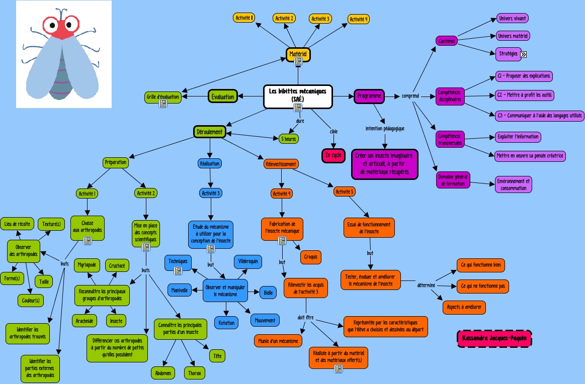 Cette carte de concepts créée avec IHMC CmapTools traite de: JacquesPaquin_Kassandra_TP4, Compétences transversales Mettre en oeuvre sa pensée créatrice, Reconnaître les principaux groupes d'arthropodes Arachnide, Les bibittes mécaniques (SAÉ) Programme, Déroulement 5 heures, Réinvestissement Activité 4, doit être Réalisée à partir du matériel et des matériaux offert(s), Activité 5 Essai de fonctionnement de l'insecte, Les bibittes mécaniques (SAÉ) Évaluation, Préparation Activité 2, détermine Aspects à améliorer, buts Connaître les principales parties d'un insecte, Essai de fonctionnement de l'insecte but Tester, évaluer et améliorer le mécanisme de l'insecte, Observer et manipuler le mécanisme Manivelle, Les bibittes mécaniques (SAÉ) Déroulement, Déroulement Réalisation, buts Identifier les arthropodes trouvés, Observer et manipuler le mécanisme Vilebrequin, Contenus Univers matériel, comprend Contenus, Réinvestir les acquis de l'activité 3 doit être