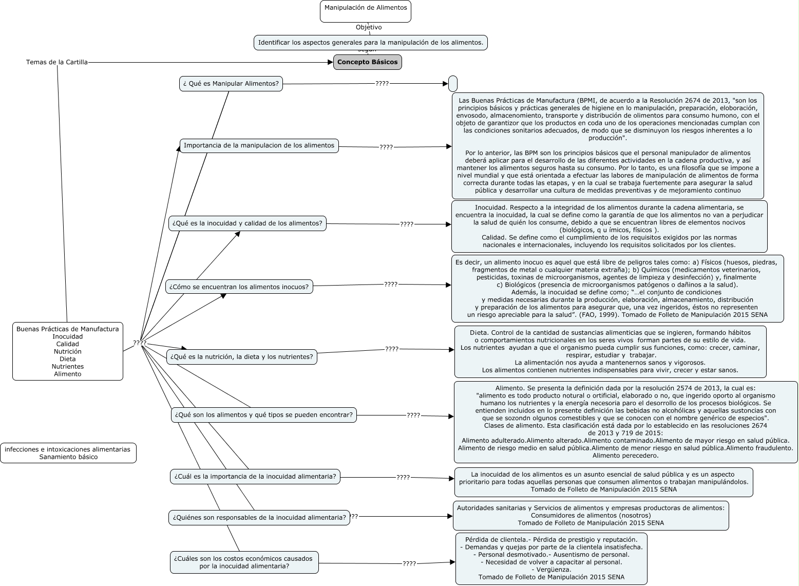 Este Cmap, tiene información relacionada con: Manipulacion_Conceptos, ¿ Qué es Manipular Alimentos? ???? Buenas Prácticas de Manufactura Inocuidad Calidad Nutrición Dieta Nutrientes Alimento, ¿Qué es la nutrición, la dieta y los nutrientes? ???? D¡eta. Control de la cantidad de sustancias alimenticias que se ingieren, formando hábitos o comportamientos nutricionales en los seres vivos forman partes de su estilo de vida. Los nutrientes ayudan a que el organismo pueda cumplir sus funciones, como: crecer, caminar, respirar, estudiar y trabajar. La alimentación nos ayuda a mantenernos sanos y vigorosos. Los alimentos contienen nutrientes indispensables para vivir, crecer y estar sanos., ¿Cómo se encuentran los alimentos inocuos? ???? Es decir, un alimento inocuo es aquel que está libre de peligros tales como: a) Físicos (huesos, piedras, fragmentos de metal o cualquier materia extraña); b) Químicos (medicamentos veterinarios, pesticidas, toxinas de microorganismos, agentes de limpieza y desinfección) y, finalmente c) Biológicos (presencia de microorganismos patógenos o dañinos a la salud). Además, la inocuidad se define como; “…el conjunto de condiciones y medidas necesarias durante la producción, elaboración, almacenamiento, distribución y preparación de los alimentos para asegurar que, una vez ingeridos, éstos no representen un riesgo apreciable para la salud”. (FAO, 1999). Tomado de Folleto de Manipulación 2015 SENA, ¿ Qué es Manipular Alimentos? ???? ¿Qué es la inocuidad y calidad de los alimentos?, ¿ Qué es Manipular Alimentos? ???? ¿Qué es la nutrición, la dieta y los nutrientes?, Importancia de la manipulacion de los alimentos ???? Las Buenas Práct¡cas de Manufactura (BPMI, de acuerdo a la Resolución 2674 de 2013, "son los principios básicos y prácticas generales de higiene en lo manipulación, preparación, eloboración, envosodo, almacenomiento, transporte y distribución de olimentos para consumo humono, con el objeto de garantizor que los productos en coda uno de los operaciones mencionadas cumplan con las condiciones sonitarios adecuados, de modo que se disminuyon los riesgos inherentes a lo producción". Por lo anterior, las BPM son los principios básicos que el personal manipulador de alimentos deberá aplicar para el desarrollo de las diferentes actividades en la cadena productiva, y así mantener los alimentos seguros hasta su consumo. Por lo tanto, es una filosofía que se impone a nivel mundial y que está orientada a efectuar las labores de manipulación de alimentos de forma correcta durante todas las etapas, y en la cual se trabaja fuertemente para asegurar la salud pública y desarrollar una cultura de medidas preventivas y de mejoramiento continuo, ¿ Qué es Manipular Alimentos? ???? ¿Qué es la inocuidad y calidad de los alimentos?, ¿Cuál es la importancia de la inocuidad alimentaria? ???? La inocuidad de los alimentos es un asunto esencial de salud pública y es un aspecto prioritario para todas aquellas personas que consumen alimentos o trabajan manipulándolos. Tomado de Folleto de Manipulación 2015 SENA, ¿Cuáles son los costos económicos causados por la inocuidad alimentaria? ???? Pérdida de clientela.- Pérdida de prestigio y reputación. - Demandas y quejas por parte de la clientela insatisfecha. - Personal desmotivado.- Ausentismo de personal. - Necesidad de volver a capacitar al personal. - Vergüenza. Tomado de Folleto de Manipulación 2015 SENA, ¿ Qué es Manipular Alimentos? ???? ¿Quiénes son responsables de la inocuidad alimentaria?, ¿ Qué es Manipular Alimentos? ???? ¿Cuál es la importancia de la inocuidad alimentaria?, ¿ Qué es Manipular Alimentos? ???? ¿Qué son los alimentos y qué tipos se pueden encontrar?, ¿ Qué es Manipular Alimentos? ???? ¿Cómo se encuentran los alimentos inocuos?, ¿ Qué es Manipular Alimentos? ???? ¿Cuáles son los costos económicos causados por la inocuidad alimentaria?, Manipulación de Alimentos Objetivo Identificar los aspectos generales para la manipulación de los alimentos., ¿ Qué es Manipular Alimentos? ???? ¿Cómo se encuentran los alimentos inocuos?, Buenas Prácticas de Manufactura Inocuidad Calidad Nutrición Dieta Nutrientes Alimento Temas de la Cartilla Concepto Básicos, ¿Qué es la inocuidad y calidad de los alimentos? ???? Inocuidad. Respecto a la integridad de los alimentos durante la cadena alimentaria, se encuentra la inocuidad, la cual se define como la garantía de que los alimentos no van a perjudicar la salud de quién los consume, debido a que se encuentran libres de elementos nocivos (biológicos, q u ímicos, físicos ). Calidad. Se define como el cumplimiento de los requisitos exigidos por las normas nacionales e internacionales, incluyendo los requisitos solicitados por los clientes., ¿ Qué es Manipular Alimentos? ???? ¿Qué es la nutrición, la dieta y los nutrientes?, ¿Quiénes son responsables de la inocuidad alimentaria? ???? Autoridades sanitarias y Servicios de alimentos y empresas productoras de alimentos: Consumidores de alimentos (nosotros) Tomado de Folleto de Manipulación 2015 SENA