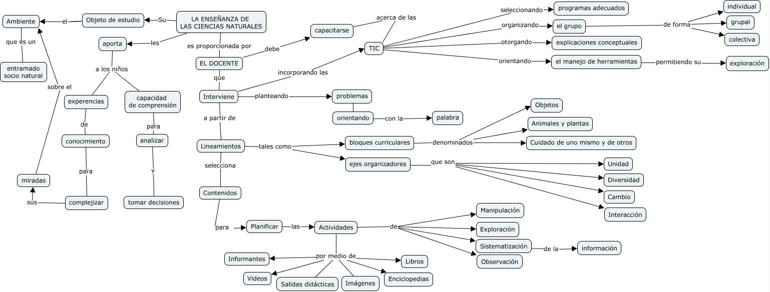 Este Cmap, tiene información relacionada con: Naturales, Lineamientos tales como bloques curriculares, Objeto de estudio el Ambiente, LA ENSEÑANZA DE LAS CIENCIAS NATURALES es proporcionada por EL DOCENTE, Planificar las Actividades, Actividades por medio de Libros, ejes organizadores que son Diversidad, Actividades por medio de Videos, ejes organizadores que son Unidad, Actividades por medio de Imágenes, capacitarse acerca de las TIC, Actividades por medio de Enciclopedias, Actividades de Observación, Ambiente que es un entramado socio natural, Actividades de Manipulación, aporta a los niños capacidad de comprensión, TIC seleccionando programas adecuados, bloques curriculares denominados Objetos, conocimiento para complejizar, bloques curriculares denominados Cuidado de uno mismo y de otros, aporta a los niños experencias