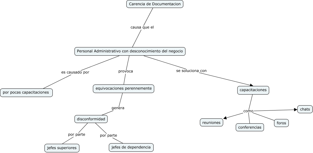 Este Cmap, tiene información relacionada con: Personal Administrativo con desconocimiento del negocio, disconformidad por parte jefes superiores, Personal Administrativo con desconocimiento del negocio provoca equivocaciones perennemente, capacitaciones como reuniones, capacitaciones como foros, disconformidad por parte jefes de dependencia, Carencia de Documentacion causa que el Personal Administrativo con desconocimiento del negocio, Personal Administrativo con desconocimiento del negocio es causado por por pocas capacitaciones, equivocaciones perennemente genera disconformidad, Personal Administrativo con desconocimiento del negocio se soluciona con capacitaciones, capacitaciones como chats, capacitaciones como conferencias