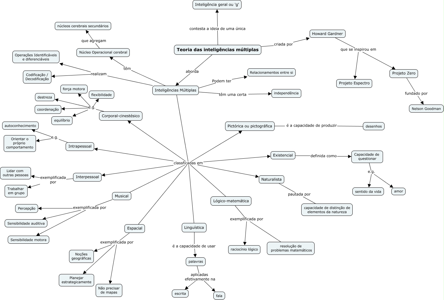 Esse mapa conceitual, produzido no IHMC CmapTools, tem a informação relacionada a: gardner, Inteligências Múltiplas classficadas em Corporal-cinestésico, Espacial exemplificada por Planejar estrategicamente, Inteligências Múltiplas têm Núcleo Operacional cerebral, Corporal-cinestésico e.g. coordenação, Existencial definida como Capacidade de questionar, Intrapessoal e.g. autoconhecimento, Inteligências Múltiplas classficadas em Espacial, Núcleo Operacional cerebral que agregam núcleos cerebrais secundários, Inteligências Múltiplas classficadas em Lógico-matemática, Inteligências Múltiplas realizam Operações Identificáveis e diferenciáveis, Musical exemplificada por Sensibilidade motora, palavras aplicadas efetivamente na escrita, Interpessoal exemplificada por Lidar com outras pessoas, Teoria das inteligências múltiplas criada por Howard Gardner, Lógico-matemática exemplificada por raciocínio lógico, Capacidade de questionar e.g. sentido da vida, Espacial exemplificada por Não precisar de mapas, Inteligências Múltiplas classficadas em Intrapessoal, Corporal-cinestésico e.g. equilíbrio, Inteligências Múltiplas realizam Codificação / Decodificação