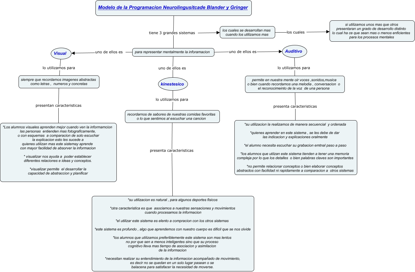 Este Cmap, tiene información relacionada con: Modelo progamacion neurolinguistico de blander y Grinder, recordarnos de sabores de nuestras comidas favoritas o lo que sentimos al escuchar una cancion presenta caracteristicas *su utilizacion es natural , para algunos deportes fisicos *otra caracteristica es que asociamos a nuestras sensaciones y movimientos cuando procesamos la informacion *el utilizar este sistema es elento a compracion con los otros sistemas *este sistema es profundo , algo que aprendemos con nuestro cuerpo es dificil que se nos olvide *los alumnos que utilizamos preferiblemente este sistema son mas lentos no por que sen a menos inteligentes sino que su proceso cognitivo lleva mas tiempo de asociacion y asimilacion de la informacion *necesitan realizar su entendimiento de la informacion acompañado de movimiento, es decir no se quedan en un solo lugar pasean o se balacena para satisfacer la necesidad de moverse., Visual lo utilizamos para siempre que recordamos imagenes abstractas como letras , numeros y concretas, kinestesico lo utilizamos para recordarnos de sabores de nuestras comidas favoritas o lo que sentimos al escuchar una cancion, Modelo de la Programacion Neurolingusitcade Blander y Gringer tiene 3 grandes sistemas para representar mentalmente la inforamacion, Auditivo lo utilizamos para permite en nuestra mente oir voces ,sonidos,musica o bien cuando recordamos una melodia , conversacion o el reconocimeinto de la voz de una persona, permite en nuestra mente oir voces ,sonidos,musica o bien cuando recordamos una melodia , conversacion o el reconocimeinto de la voz de una persona presenta caracteristicas *su utilizacion la realizamos de manera secuencial y ordenada *quienes aprender en este sistema , se les debe de dar las indicacion y explicaciones oralmente *el alumno necesita escuchar su grabacion emtnal paso a paso *los alumnos que utilzan este sistema tienden a tener una memoria compleja por lo que los detalles o bien palabras claves son importantes *no permite relacionar conceptos o bien elaborar conceptos abstractos con facilidad ni rapidamente a comparacion a otros sistemas, Modelo de la Programacion Neurolingusitcade Blander y Gringer tiene 3 grandes sistemas los cuales se desarrollan mas cuando los utilizamos mas, siempre que recordamos imagenes abstractas como letras , numeros y concretas presentan caracteristicas *Los alumnos visuales aprenden mejor cuando ven la informamcion las personas entienden mas fotograficamente, o con esquemas a comparacion de solo escuchar la explicacion esto les sucede a quienes utilizan mas este sistemay aprende con mayor facilidad de absorver la informacion * visualizar nos ayuda a poder establecer diferentes relaciones e ideas y conceptos. *visualizar permite el desarrollar la capacidad de abstraccion y planificar, para representar mentalmente la inforamacion uno de ellos es Auditivo, los cuales se desarrollan mas cuando los utilizamos mas los cuales si utilizamos unos mas que otros presentaran un grado de desarrollo distinto lo cual ha ce que sean mas o menos enficientes para los procesos mentales, para representar mentalmente la inforamacion uno de ellos es kinestesico, para representar mentalmente la inforamacion uno de ellos es Visual
