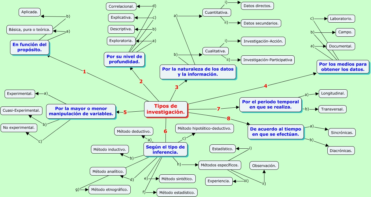 Este Cmap, tiene información relacionada con: Tipos_Investigacion, Por la mayor o menor manipulación de variables. c) No experimental., Tipos de investigación. 7 Por el periodo temporal en que se realiza., Por la mayor o menor manipulación de variables. b) Cuasi-Experimental., Por los medios para obtener los datos. b) Campo., Tipos de investigación. 3 Por la naturaleza de los datos y la información., Tipos de investigación. 6 Según el tipo de inferencia., Por el periodo temporal en que se realiza. b) Transversal., Tipos de investigación. 5 Por la mayor o menor manipulación de variables., Cualitativa. ii) Investigación-Participativa, Según el tipo de inferencia. d) Método analítico., De acuerdo al tiempo en que se efectúan. b) Diacrónicas., Por su nivel de profundidad. b) Descriptiva., Tipos de investigación. 2 Por su nivel de profundidad., Según el tipo de inferencia. g) Método etnográfico., Según el tipo de inferencia. h) Métodos específicos., Por el periodo temporal en que se realiza. a) Longitudinal., Por los medios para obtener los datos. c) Laboratorio., Por la naturaleza de los datos y la información. b) Cualitativa., En función del propósito. b) Aplicada., Por la naturaleza de los datos y la información. a) Cuantitativa.