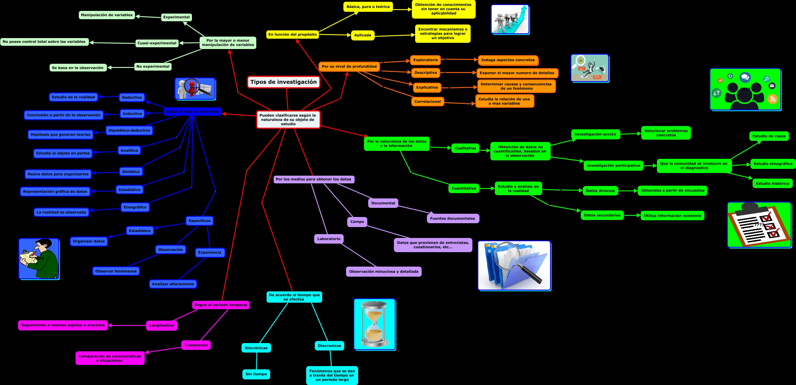 Este Cmap, tiene información relacionada con: Tipos de Investigación, Observación ???? Observar fenómenos, Según el periodo temporal ???? Longitudinal, Documental ???? Fuentes documentales, Datos directos ???? Obtenidos a partir de encuestas, Cuantitativa ???? Estudio y análisis de la realidad, Según el tipo de inferencia . Etnográfico, Aplicada ???? Encontrar mecanismos o estrategias para lograr un objetivo, Que la comunidad se involucre en el diagnostico ???? Estudio histórico, Deductivo ???? Estudio de la realidad, Investigación participativa ???? Que la comunidad se involucre en el diagnostico, Etnográfico ???? La realidad es observada, Pueden clasificarse según la naturaleza de su objeto de estudio . Por su nivel de profundidad, Por su nivel de profundidad . Explicativa, Por la mayor o menor manipulación de variables ???? Cuasi-experimental, Explicativa , Determinar causas y consecuencias de un fenómeno, Pueden clasificarse según la naturaleza de su objeto de estudio ???? Por los medios para obtener los datos, Por los medios para obtener los datos ???? Campo, Según el tipo de inferencia ???? Inductivo, Campo ???? Datos que provienen de entrevistas, cuestionarios, etc..., De acuerdo al tiempo que se efectúa ???? Sincrónicas