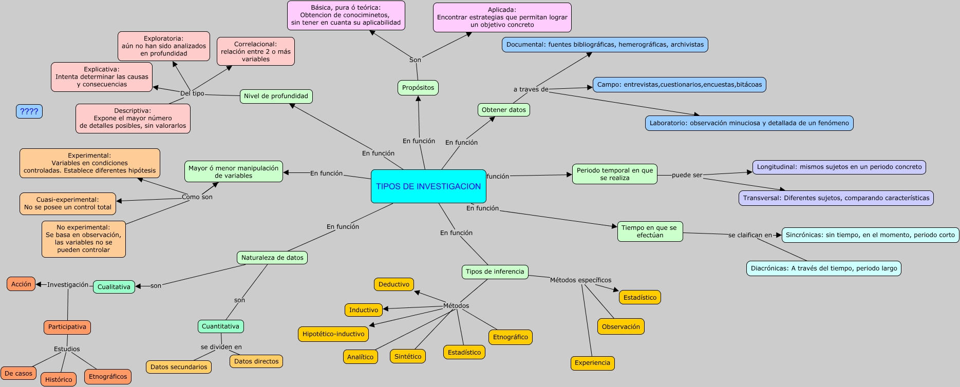 Este Cmap, tiene información relacionada con: tipos de investigación, TIPOS DE INVESTIGACION En función Propósitos, Tipos de inferencia Métodos Hipotético-inductivo, Obtener datos a traves de Campo: entrevistas,cuestionarios,encuestas,bitácoas, Periodo temporal en que se realiza puede ser Transversal: Diferentes sujetos, comparando características, Mayor ó menor manipulación de variables Como son Experimental: Variables en condiciones controladas. Establece diferentes hipótesis, Tipos de inferencia Métodos Deductivo, Participativa Estudios Etnográficos, Nivel de profundidad Del tipo Correlacional: relación entre 2 o más variables, Tipos de inferencia Métodos específicos Estadístico, Tipos de inferencia Métodos Inductivo, Nivel de profundidad Del tipo Exploratoria: aún no han sido analizados en profundidad, TIPOS DE INVESTIGACION En función Obtener datos, Mayor ó menor manipulación de variables Como son Cuasi-experimental: No se posee un control total, Tipos de inferencia Métodos Etnográfico, Nivel de profundidad Del tipo Descriptiva: Expone el mayor número de detalles posibles, sin valorarlos, Propósitos Son Básica, pura ó teórica: Obtencion de conociminetos, sin tener en cuanta su aplicabilidad, Cualitativa Investigación Participativa, Participativa Estudios Histórico, Tipos de inferencia Métodos específicos Observación, Obtener datos a traves de Documental: fuentes bibliográficas, hemerográficas, archivistas