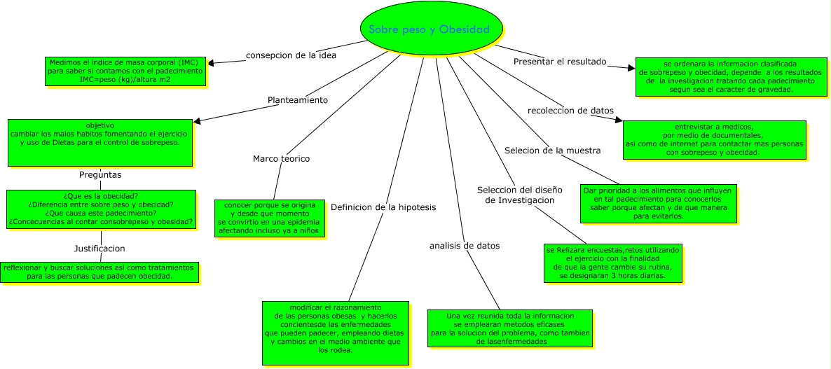 Este Cmap, tiene información relacionada con: obecidad y sobrepeso, Sobre peso y Obesidad Definicion de la hipotesis modificar el razonamiento de las personas obesas y hacerlos concientesde las enfermedades que pueden padecer, empleando dietas y cambios en el medio ambiente que los rodea., Sobre peso y Obesidad recoleccion de datos entrevistar a medicos, por medio de documentales, asi como de internet para contactar mas personas con sobrepeso y obecidad., Sobre peso y Obesidad Selecion de la muestra Dar prioridad a los alimentos que influyen en tal padecimiento para conocerlos saber porque afectan y de que manera para evitarlos., Sobre peso y Obesidad Presentar el resultado se ordenara la informacion clasificada de sobrepeso y obecidad, depende a los resultados de la investigacion tratando cada padecimiento segun sea el caracter de gravedad., Sobre peso y Obesidad analisis de datos Una vez reunida toda la informacion se emplearan metodos eficases para la solucion del problema, como tambien de lasenfermedades, Sobre peso y Obesidad Marco teorico conocer porque se origina y desde que momento se convirtio en una epidemia afectando incluso ya a niños, ¿Que es la obecidad? ¿Diferencia entre sobre peso y obecidad? ¿Que causa este padecimiento? ¿Concecuencias al contar consobrepeso y obesidad? Justificacion reflexionar y buscar soluciones asi como tratamientos para las personas que padecen obecidad., Sobre peso y Obesidad Seleccion del diseño de Investigacion se Relizara encuestas,retos utilizando el ejercicio con la finalidad de que la gente cambie su rutina, se designaran 3 horas diarias., objetivo cambiar los malos habitos fomentando el ejercicio y uso de Dietas para el control de sobrepeso. Preguntas ¿Que es la obecidad? ¿Diferencia entre sobre peso y obecidad? ¿Que causa este padecimiento? ¿Concecuencias al contar consobrepeso y obesidad?, Sobre peso y Obesidad consepcion de la idea Medimos el indice de masa corporal (IMC) para saber si contamos con el padecimiento IMC=peso (kg)/altura m2, Sobre peso y Obesidad Planteamiento objetivo cambiar los malos habitos fomentando el ejercicio y uso de Dietas para el control de sobrepeso.