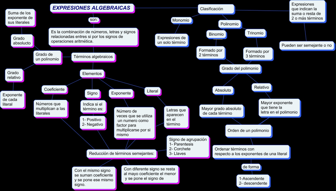 Este Cmap, tiene información relacionada con: MATEMATICAS, Clasificación ???? EXPRESIONES ALGEBRAICAS, Suma de los exponente de sus literales ???? Grado absolucto, Binomio ???? Polinomio, Expresiones de un solo término Monomio Clasificación, Reducción de términos semejantes: ???? Número de veces que se utiliza un numero como factor para multiplicarse por si mismo, Número de veces que se utiliza un numero como factor para multiplicarse por si mismo ???? Exponente, Relativo ???? Grado del polimonio, Reducción de términos semejantes: ???? Números que multiplican a las literales, Letras que aparecen en el término ???? Literal, Literal ???? Elementos, Grado de un polinomio ???? Términos algebraicos, Reducción de términos semejantes: ???? Letras que aparecen en el término, Trinomio ???? Polinomio, ???? ???? Mayor grado absoluto de cada térnimo, Absoluto ???? Mayor grado absoluto de cada térnimo, Exponente de cada literal ???? Grado relativo, Números que multiplican a las literales ???? Coeficiente, Términos algebraicos ???? Es la combinación de números, letras y signos relacionadas entres si por los signos de operaciones aritmética., Grado absolucto ???? Grado de un polinomio, Exponente ???? Elementos