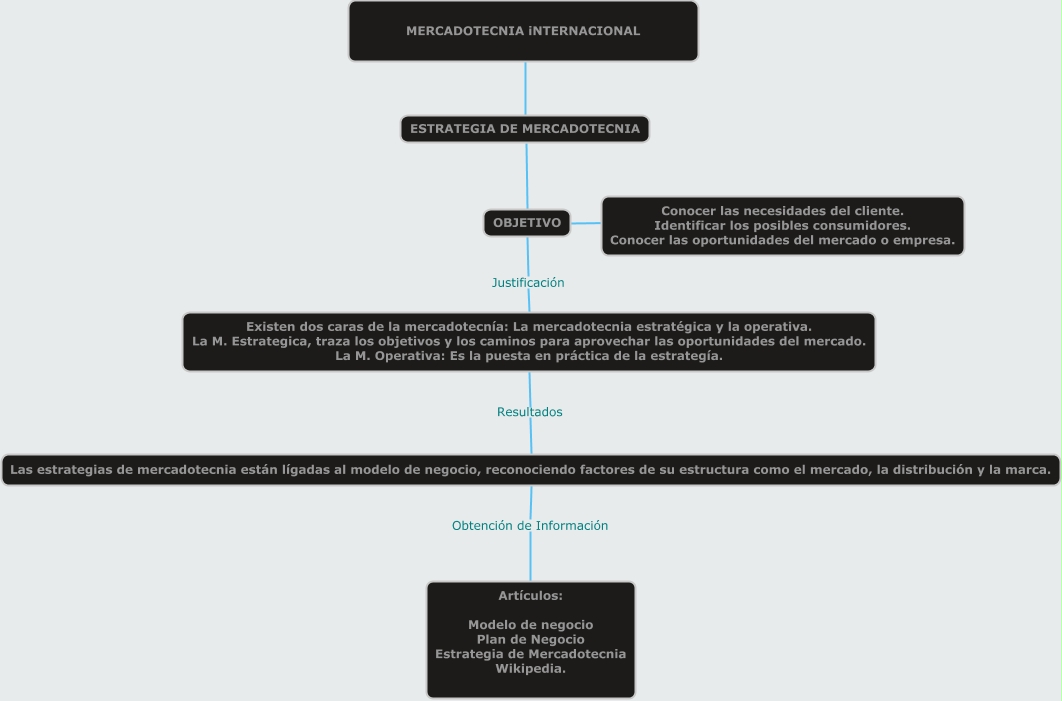 Este Cmap, tiene información relacionada con: diana_pérez_esquema.pdf, OBJETIVO ???? Conocer las necesidades del cliente. Identificar los posibles consumidores. Conocer las oportunidades del mercado o empresa., ESTRATEGIA DE MERCADOTECNIA ???? OBJETIVO, Existen dos caras de la mercadotecnía: La mercadotecnia estratégica y la operativa. La M. Estrategica, traza los objetivos y los caminos para aprovechar las oportunidades del mercado. La M. Operativa: Es la puesta en práctica de la estrategía. Resultados Las estrategias de mercadotecnia están lígadas al modelo de negocio, reconociendo factores de su estructura como el mercado, la distribución y la marca., OBJETIVO Justificación Existen dos caras de la mercadotecnía: La mercadotecnia estratégica y la operativa. La M. Estrategica, traza los objetivos y los caminos para aprovechar las oportunidades del mercado. La M. Operativa: Es la puesta en práctica de la estrategía., Las estrategias de mercadotecnia están lígadas al modelo de negocio, reconociendo factores de su estructura como el mercado, la distribución y la marca. Obtención de Información Artículos: Modelo de negocio Plan de Negocio Estrategia de Mercadotecnia Wikipedia., MERCADOTECNIA iNTERNACIONAL ???? ESTRATEGIA DE MERCADOTECNIA