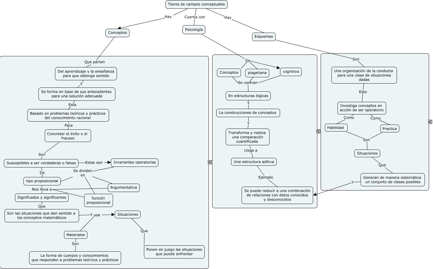 Este Cmap, tiene información relacionada con: teoria de campos conceptuales 2, En estructuras lógicas Y La construcciones de conceptos, Practica Son Situaciones, Habilidad Son Situaciones, Esquemas Son Una organización de la conducta para una clase de situaciones dadas, La construcciones de conceptos Y Transforma y realiza una comparación cuantificada, Materiales Son La forma de cuerpos y conocimientos que responden a problemas teóricos y prácticos, Concretar el éxito o el fracaso Son Susceptibles a ser verdaderas o falsas, Susceptibles a ser verdaderas o falsas De tipo proposicional, Son las situaciones que dan sentido a los conceptos matemáticos Y usa Situaciones, Conceptos Se centran En estructuras lógicas, tipo proposicional Nos lleva a Significados y significantes, Transforma y realiza una comparación cuantificada Llega a Una estructura aditiva, Basado en problemas teóricos y prácticos del conocimiento racional Para Concretar el éxito o el fracaso, Invariantes operatorias Se dividen en tipo proposicional, Significados y significantes Que Son las situaciones que dan sentido a los conceptos matemáticos, Se forma en base de sus antecedentes para una solución adecuada Esta Basado en problemas teóricos y prácticos del conocimiento racional, cognitiva Se centran En estructuras lógicas, Teoria de campos conceptuales Cuenta con Psicología, Son las situaciones que dan sentido a los conceptos matemáticos Y usa Materiales, piagetiana Se centran En estructuras lógicas