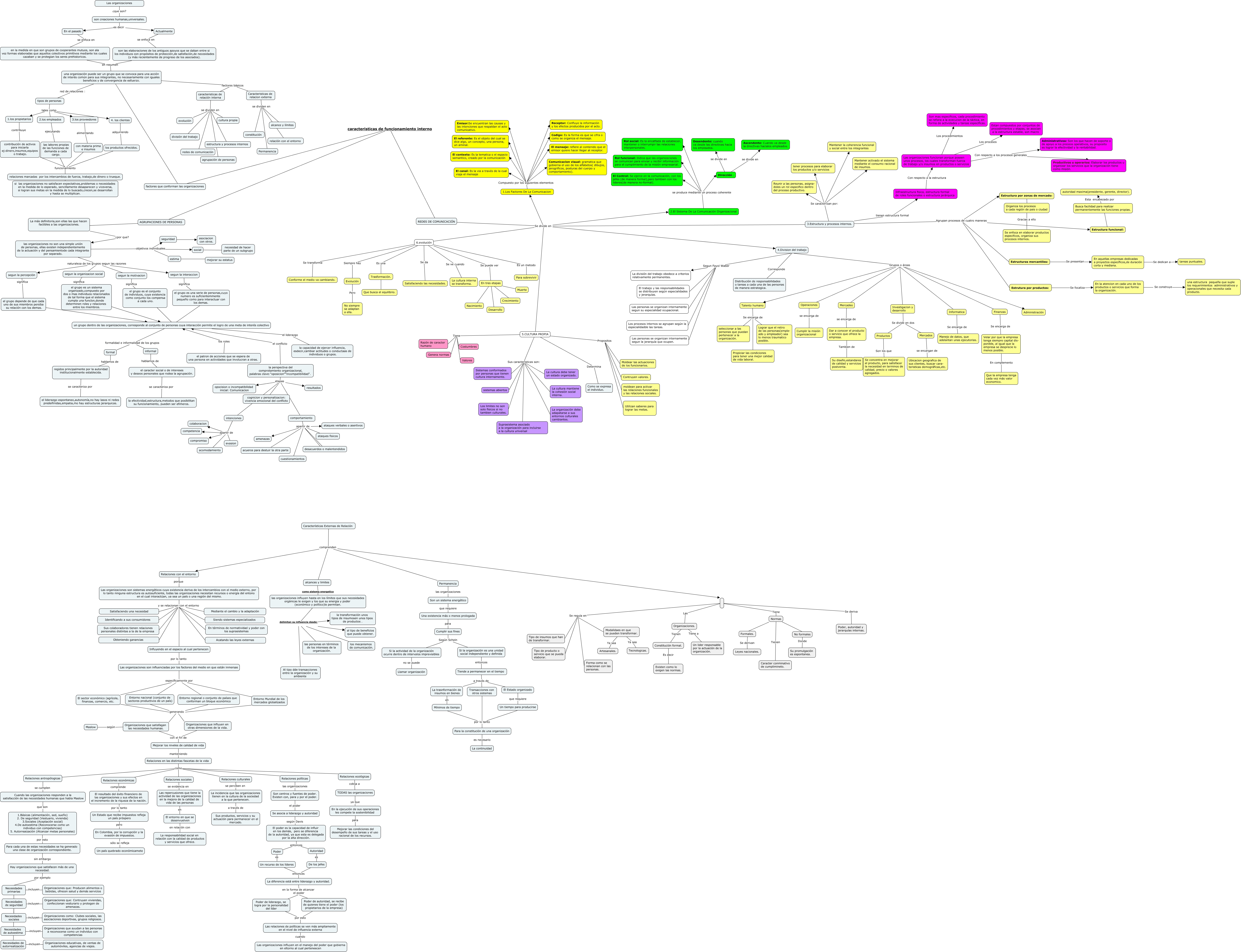 Este Cmap, tiene información relacionada con: admin, Relaciones en las distintas fascetas de la vida como Relaciones culturales, Permanencia comprenden Relaciones con el entorno, Son centros y fuentes de poder. Existen con, para y por el poder. el poder Se asocia a liderazgo y autoridad, comportamiento apartir de cuestionamientos, Relaciones en las distintas fascetas de la vida como Relaciones ecológicas, Relaciones culturales se perciben en La incidencia que las organizaciones tienen en la cultura de la sociedad a la que pertenecen., 1.Los Factores De La Comunicacion Compuesto por los siguientes elementos Codigo: Es la forma es que se cifra o como se organiza el mensaje., 5.CULTURA PROPIA Sus caracteristicas son: Sistemas conformados por personas que tienen cultura internamente., Para cada una de estas necesidades se ha generado una clase de organización correspondiente. sin embargo Hay organizaciones que satisfacen más de una necesidad., un grupo dentro de las organizaciones, corresponde al conjunto de personas cuya interacción permite el logro de una meta de interés colectivo el liderazgo la capacidad de ejercer influencia, esdecir,cambiar actitudes o conductaas de individuos o grupos., 6.evolución Siempre hay Evolución, Las organizaciones funcionan porque poseen unos procesos, los cuales transforman fuerza de trabajo y/o insumos en productos o servicios Con respecto a los procesos generales Administrativos: Son los que hacen de soporte o de apoyo a los preceos operativos, su proposito es lograr la efectividad y la rentabilidad., En Colombia, por la corrupción y la evasión de impuestos. sólo se refleja Un país quebrado económicamete, el grupo es el conjunto de individuos, cuya existencia como conjunto los compensa a cada uno. ???? un grupo dentro de las organizaciones, corresponde al conjunto de personas cuya interacción permite el logro de una meta de interés colectivo, 5.CULTURA PROPIA Sus caracteristicas son: Suprasistema asociado a la organización para incluirse a la cultura universal, Las organizaciones son sistemas energéticos cuya existencia deriva de los intercambios con el medio externo, por lo tanto ninguna estructura es autosuficiente, todas las organizaciones necesitan recursos o energía del entono en el cual interactúan, ya sea un país o una región del mismo. y se relacionan con el entorno Mediante el cambio y la adaptación, 4.Division del trabajo Segun Fayol Waber Los procesos internos se agrupan según la especialidadde las tareas., Entorno Mundial de los mercados globalizados generando Organizaciones que influyen en otras dimensiones de la vida., 5.CULTURA PROPIA Tiene Costumbres, 2.los empleados ejecutando las labores propias de las funciones de demanda a cada cargo.