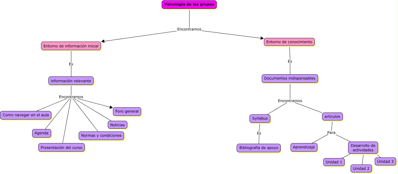 Este Cmap, tiene información relacionada con: Psicologia de los grupos-reconocimiento, información relevante Encontramos Normas y condiciones, Psicologia de los grupos Encontramos Entorno de información inicial, información relevante Encontramos Foro general, información relevante Encontramos Presentación del curso, Psicologia de los grupos Encontramos Entorno de conocimiento, Desarrollo de actividades ???? Unidad 3, Entorno de información inicial Es información relevante, Documentos indispensables Encontramos Syllabus, Entorno de conocimiento Es Documentos indispensables, información relevante Encontramos Agenda, información relevante Encontramos Como navegar en el aula, información relevante Encontramos Noticias, articulos Para Desarrollo de actividades, Desarrollo de actividades ???? Unidad 1, Desarrollo de actividades ???? Unidad 2, articulos Para Aprendizaje, Syllabus Es Bibliografia de apoyo, Documentos indispensables Encontramos articulos