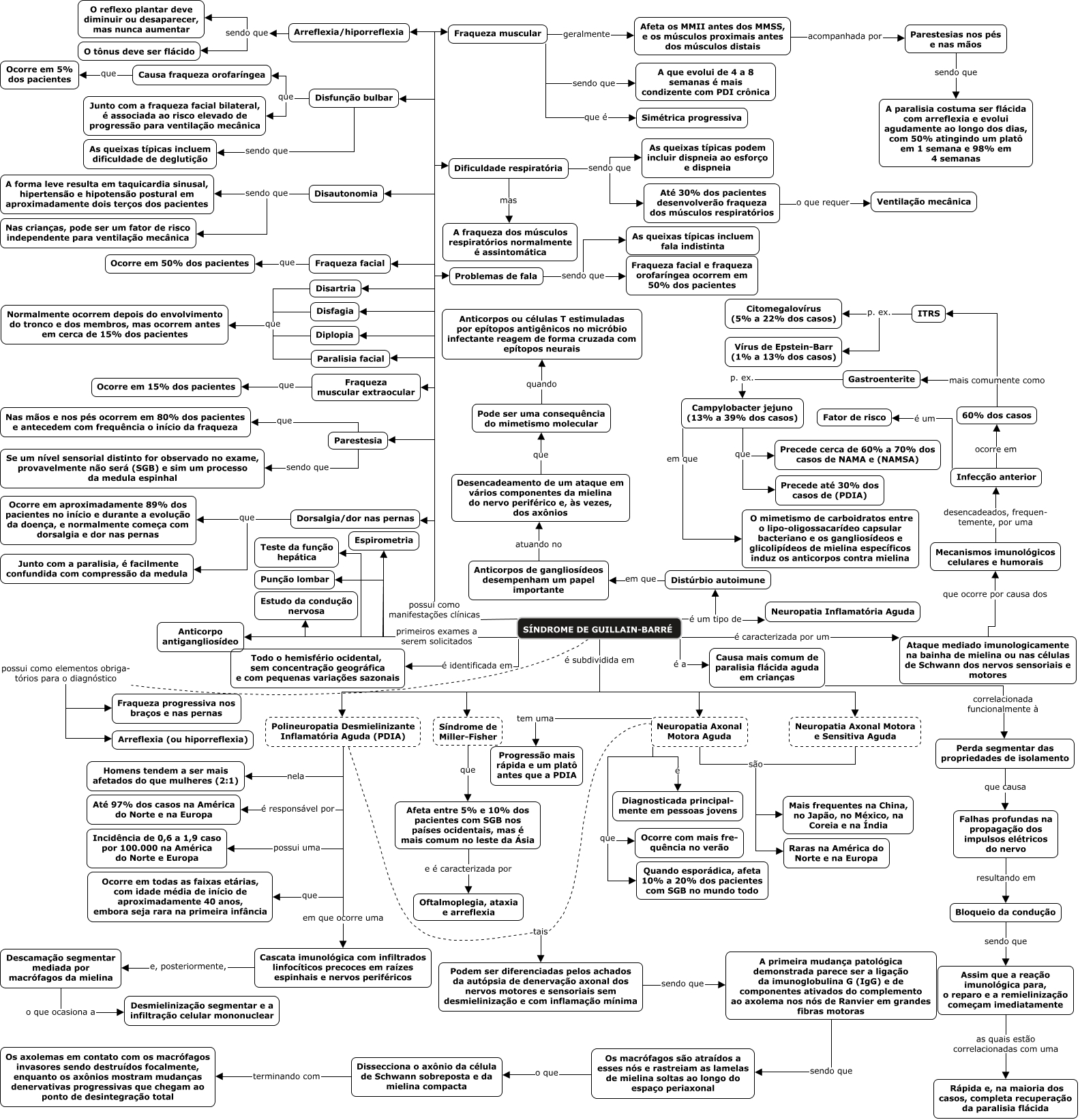 Esse mapa conceitual, produzido no IHMC CmapTools, tem a informação relacionada a: SGB, Distúrbio autoimune em que Anticorpos de gangliosídeos desempenham um papel importante, Disautonomia sendo que Nas crianças, pode ser um fator de risco independente para ventilação mecânica, Dificuldade respiratória sendo que As queixas típicas podem incluir dispneia ao esforço e dispneia, Desencadeamento de um ataque em vários componentes da mielina do nervo periférico e, às vezes, dos axônios que Pode ser uma consequência do mimetismo molecular, S�?NDROME DE GUILLAIN-BARRÉ é subdividida em Neuropatia Axonal Motora e Sensitiva Aguda, Fraqueza muscular que é Simétrica progressiva, Problemas de fala sendo que As queixas típicas incluem fala indistinta, Polineuropatia Desmielinizante Inflamatória Aguda (PDIA) em que ocorre uma Cascata imunológica com infiltrados linfocíticos precoces em raízes espinhais e nervos periféricos, Disfunção bulbar que Junto com a fraqueza facial bilateral, é associada ao risco elevado de progressão para ventilação mecânica, Afeta entre 5% e 10% dos pacientes com SGB nos países ocidentais, mas é mais comum no leste da �?sia e é caracterizada por Oftalmoplegia, ataxia e arreflexia, Bloqueio da condução sendo que Assim que a reação imunológica para, o reparo e a remielinização começam imediatamente, S�?NDROME DE GUILLAIN-BARRÉ possui como manifestações clínicas Fraqueza muscular, S�?NDROME DE GUILLAIN-BARRÉ possui como manifestações clínicas Arreflexia/hiporreflexia, Neuropatia Axonal Motora Aguda que Ocorre com mais fre- quência no verão, Arreflexia/hiporreflexia sendo que O reflexo plantar deve diminuir ou desaparecer, mas nunca aumentar, S�?NDROME DE GUILLAIN-BARRÉ é um tipo de Distúrbio autoimune, S�?NDROME DE GUILLAIN-BARRÉ possui como elementos obriga- tórios para o diagnóstico Fraqueza progressiva nos braços e nas pernas, Fraqueza muscular extraocular que Ocorre em 15% dos pacientes, ITRS p. ex. Citomegalovírus (5% a 22% dos casos), S�?NDROME DE GUILLAIN-BARRÉ possui como manifestações clínicas Disartria