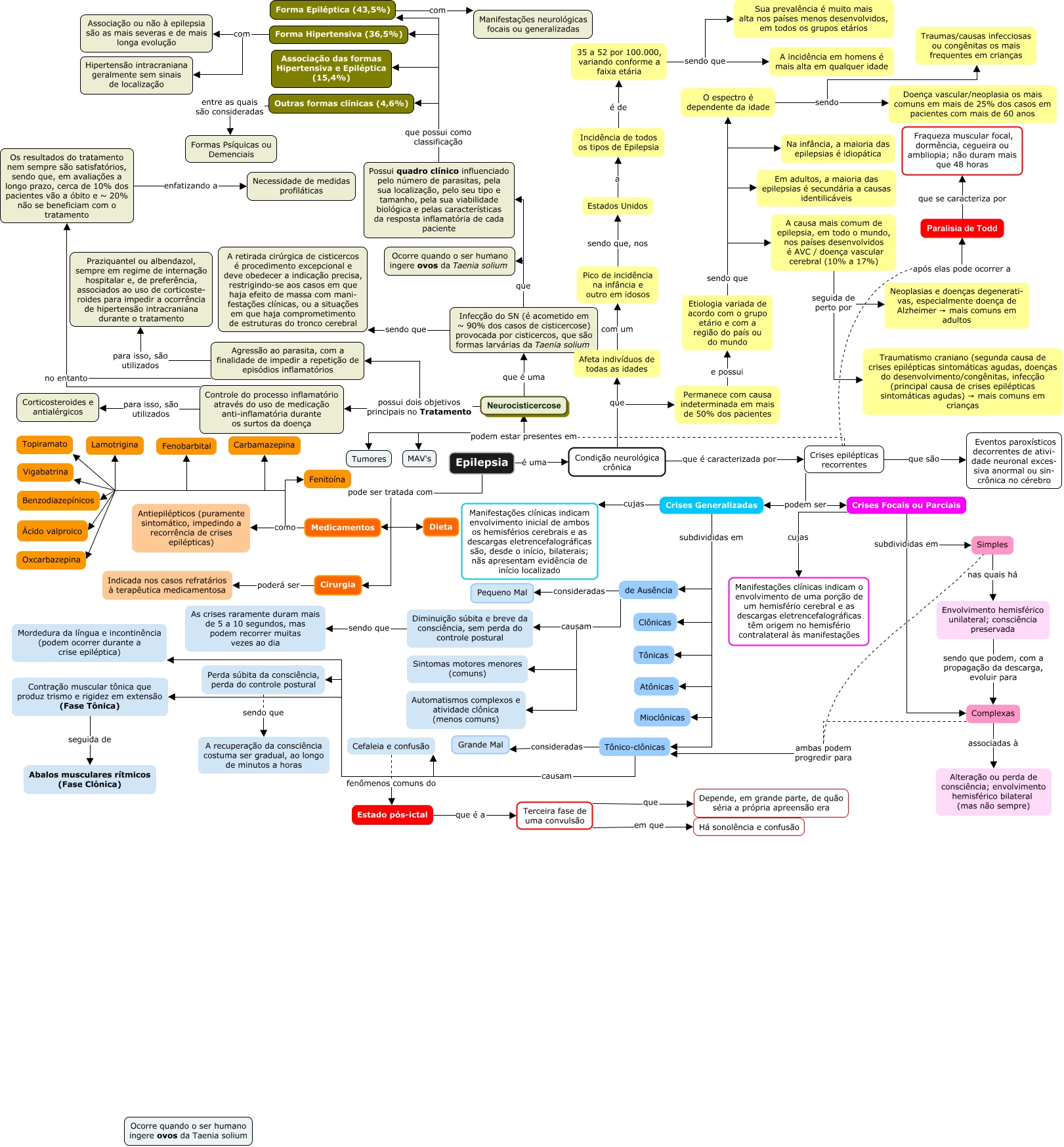 Esse mapa conceitual, produzido no IHMC CmapTools, tem a informação relacionada a: Epilepsia, Envolvimento hemisférico unilateral; consciência preservada sendo que podem, com a propagação da descarga, evoluir para Complexas, Crises Generalizadas subdivididas em Tônicas, Crises epilépticas recorrentes que são Eventos paroxísticos decorrentes de ativi- dade neuronal exces- siva anormal ou sin- crônica no cérebro, Neurocisticercose que é uma Infecção do SN (é acometido em ~ 90% dos casos de cisticercose) provocada por cisticercos, que são formas larvárias da Taenia solium, O espectro é dependente da idade sendo Doença vascular/neoplasia os mais comuns em mais de 25% dos casos em pacientes com mais de 60 anos, Crises Generalizadas cujas Manifestações clínicas indicam envolvimento inicial de ambos os hemisférios cerebrais e as descargas eletrencefalográficas são, desde o início, bilaterais; nãs apresentam evidência de início localizado, de Ausência causam Sintomas motores menores (comuns), Forma Hipertensiva (36,5%) com Associação ou não à epilepsia são as mais severas e de mais longa evolução, O espectro é dependente da idade sendo Traumas/causas infecciosas ou congênitas os mais frequentes em crianças, A causa mais comum de epilepsia, em todo o mundo, nos países desenvolvidos é AVC / doença vascular cerebral (10% a 17%) seguida de perto por Traumatismo craniano (segunda causa de crises epilépticas sintomáticas agudas, doenças do desenvolvimento/congênitas, infecção (principal causa de crises epilépticas sintomáticas agudas) → mais comuns em crianças, Crises Generalizadas subdivididas em Tônico-clônicas, Cefaleia e confusão fenômenos comuns do Estado pós-ictal, Possui quadro clínico influenciado pelo número de parasitas, pela sua localização, pelo seu tipo e tamanho, pela sua viabilidade biológica e pelas características da resposta inflamatória de cada paciente que possui como classificação Forma Hipertensiva (36,5%), Forma Hipertensiva (36,5%) com Hipertensão intracraniana geralmente sem sinais de localização, Controle do processo inflamatório através do uso de medicação anti-inflamatória durante os surtos da doença para isso, são utilizados Corticosteroides e antialérgicos, Crises epilépticas recorrentes podem estar presentes em Neurocisticercose, Incidência de todos os tipos de Epilepsia é de 35 a 52 por 100.000, variando conforme a faixa etária, Crises epilépticas recorrentes podem estar presentes em Tumores, Medicamentos como Benzodiazepínicos, Contração muscular tônica que produz trismo e rigidez em extensão (Fase Tônica) seguida de Abalos musculares rítmicos (Fase Clônica)