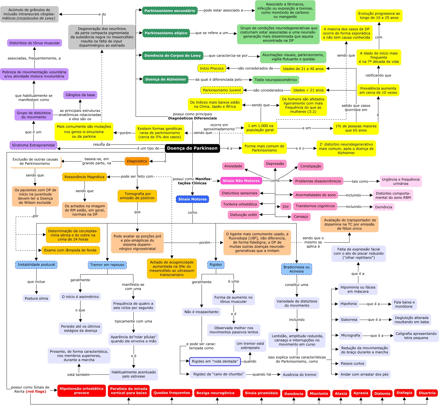 Esse mapa conceitual, produzido no IHMC CmapTools, tem a informação relacionada a: Doença de Parkinson, Sinais Motores como Rigidez, O início é assimétrico o que Persiste até os últimos estágios da doença, Exclusão de outras causas de Parkinsonismo sendo que Os pacientes com DP de início na juventude devem ter a Doença de Wilson excluída, Doença de Parkinson possui como Sinais de Alerta (red flags) Hipotensão ortostática precoce, Doença de Alzheimer da qual é diferenciada pelo Teste neuropsicométrico, Doença de Parkinson possui como principais Diagnósticos Diferenciais Doença de Alzheimer, Os pacientes com DP de início na juventude devem ter a Doença de Wilson excluída por Determinação da ceruloplas- mina sérica e do cobre na urina de 24 horas, Forma mais comum de Parkinsonismo e é o 2° distúrbio neurodegenerativo mais comum, após a doença de Alzheimer, Lentidão, amplitude reduzida, cansaço e interrupções no movimento em curso isso explica outras características do Parkinsonismo, como Hipomimia ou fácies em máscara, Doença de Parkinson ocorre em aproximadamente 1 em 1.000 na população geral, 1% de pessoas maiores que 65 anos sendo que casos ocorridos em Idades de 21 a 40 anos, Lentidão, amplitude reduzida, cansaço e interrupções no movimento em curso isso explica outras características do Parkinsonismo, como Sialorreia, Bradicinesia ou Acinesia constitui uma Variedade de distúrbios do movimento, Sinais Não Motores como Depressão, Diagnóstico pode ser feito com Tomografia por emissão de pósitron, Síndrome Extrapiramidal que é um Grupo de distúrbios do movimento, 1% de pessoas maiores que 65 anos sendo que casos ocorridos em Idades < 21 anos, Sinais Não Motores como Constipação, Diagnóstico pode ser feito com Ressonância Magnética, Lentidão, amplitude reduzida, cansaço e interrupções no movimento em curso isso explica outras características do Parkinsonismo, como Passos curtos
