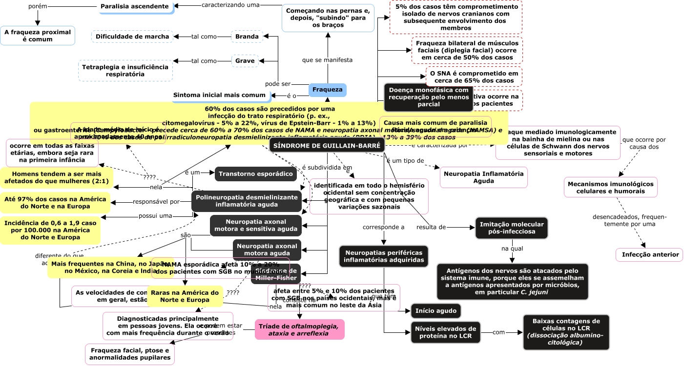 Esse mapa conceitual, produzido no IHMC CmapTools, tem a informação relacionada a: Síndrome de Guillain-Barré, Neuropatia axonal motora e sensitiva aguda são Mais frequentes na China, no Japão, no México, na Coreia e lndia, Polineuropatia desmielinizante inflamatória aguda possui uma Incidência de 0,6 a 1,9 caso por 100.000 na América do Norte e Europa, Neuropatia axonal motora aguda ???? NAMA esporádica afeta 10% a 20% dos pacientes com SGB no mundo todo., S�?NDROME DE GUILLAIN-BARRÉ é subdividida em Neuropatia axonal motora e sensitiva aguda, S�?NDROME DE GUILLAIN-BARRÉ possui como Manifestações Clínicas 5% dos casos têm comprometimento isolado de nervos cranianos com subsequente envolvimento dos membros, Síndrome de Miller-Fisher ???? afeta entre 5% e 10% dos pacientes com SGB nos países ocidentais, mas é mais comum no leste da �?sia, S�?NDROME DE GUILLAIN-BARRÉ é um tipo de Neuropatia Inflamatória Aguda, S�?NDROME DE GUILLAIN-BARRÉ é subdividida em Polineuropatia desmielinizante inflamatória aguda, Polineuropatia desmielinizante inflamatória aguda ???? A idade média de início é aproximadamente 40 anos, S�?NDROME DE GUILLAIN-BARRÉ possui como Manifestações Clínicas Perda sensitiva ocorre na maioria dos pacientes, Mecanismos imunológicos celulares e humorais desencadeados, frequen- temente por uma Infecção anterior, S�?NDROME DE GUILLAIN-BARRÉ é identificada em todo o hemisfério ocidental sem concentração geográfica e com pequenas variações sazonais, Neuropatia axonal motora aguda ???? Diagnosticadas principalmente em pessoas jovens. Ela ocorre com mais frequência durante o verão, Síndrome de Miller-Fisher consiste na Tríade de oftalmoplegia, ataxia e arreflexia, Níveis elevados de proteína no LCR com Baixas contagens de células no LCR (dissociação albumino- citológica), Tríade de oftalmoplegia, ataxia e arreflexia e podem estar presentes Fraqueza facial, ptose e anormalidades pupilares, Grave tal como Tetraplegia e insuficiência respiratória, S�?NDROME DE GUILLAIN-BARRÉ possui como Manifestações Clínicas Fraqueza bilateral de músculos faciais (diplegia facial) ocorre em cerca de 50% dos casos, S�?NDROME DE GUILLAIN-BARRÉ possui como Manifestações Clínicas Fraqueza, Fraqueza que se manifesta Começando nas pernas e, depois, "subindo" para os braços