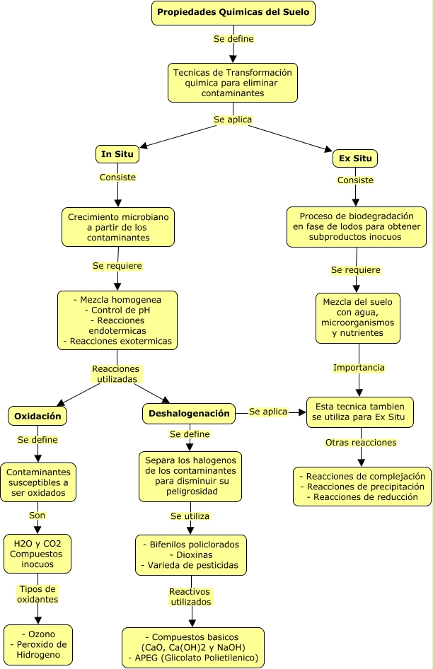 Este Cmap, tiene información relacionada con: Tratamientos Quimicos del Suelo, Separa los halogenos de los contaminantes para disminuir su peligrosidad Se utiliza - Bifenilos policlorados - Dioxinas - Varieda de pesticidas, H2O y CO2 Compuestos inocuos Tipos de oxidantes - Ozono - Peroxido de Hidrogeno, Tecnicas de Transformación quimica para eliminar contaminantes Se aplica Ex Situ, Esta tecnica tambien se utiliza para Ex Situ Otras reacciones - Reacciones de complejación - Reacciones de precipitación - Reacciones de reducción, In Situ Consiste Crecimiento microbiano a partir de los contaminantes, - Mezcla homogenea - Control de pH - Reacciones endotermicas - Reacciones exotermicas Reacciones utilizadas Deshalogenación, Propiedades Quimicas del Suelo Se define Tecnicas de Transformación quimica para eliminar contaminantes, Tecnicas de Transformación quimica para eliminar contaminantes Se aplica In Situ, Oxidación Se define Contaminantes susceptibles a ser oxidados, Ex Situ Consiste Proceso de biodegradación en fase de lodos para obtener subproductos inocuos, Deshalogenación Se define Separa los halogenos de los contaminantes para disminuir su peligrosidad, - Bifenilos policlorados - Dioxinas - Varieda de pesticidas Reactivos utilizados - Compuestos basicos (CaO, Ca(OH)2 y NaOH) - APEG (Glicolato Polietilenico), Deshalogenación Se aplica Esta tecnica tambien se utiliza para Ex Situ, Crecimiento microbiano a partir de los contaminantes Se requiere - Mezcla homogenea - Control de pH - Reacciones endotermicas - Reacciones exotermicas, Mezcla del suelo con agua, microorganismos y nutrientes Importancia Esta tecnica tambien se utiliza para Ex Situ, Contaminantes susceptibles a ser oxidados Son H2O y CO2 Compuestos inocuos, - Mezcla homogenea - Control de pH - Reacciones endotermicas - Reacciones exotermicas Reacciones utilizadas Oxidación, Proceso de biodegradación en fase de lodos para obtener subproductos inocuos Se requiere Mezcla del suelo con agua, microorganismos y nutrientes