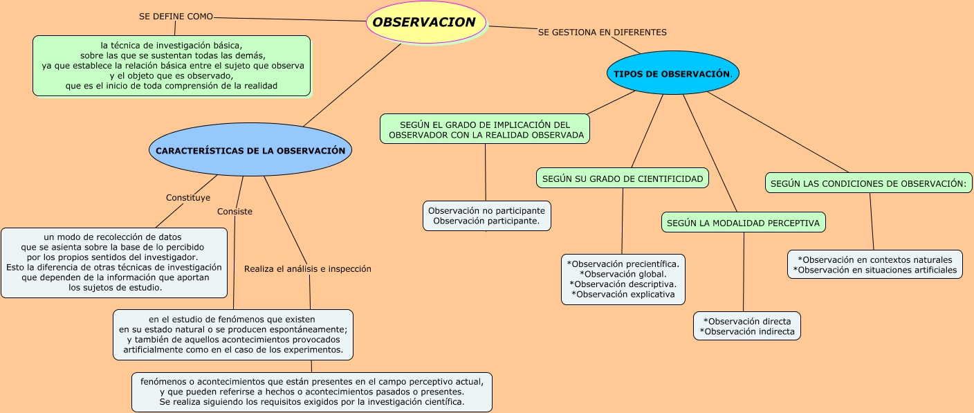 Este Cmap, tiene información relacionada con: ODSERVACION, CARACTERÍSTICAS DE LA OBSERVACIÓN Realiza el análisis e inspección fenómenos o acontecimientos que están presentes en el campo perceptivo actual, y que pueden referirse a hechos o acontecimientos pasados o presentes. Se realiza siguiendo los requisitos exigidos por la investigación científica., OBSERVACION CARACTERÍSTICAS DE LA OBSERVACIÓN, SEGÚN LA MODALIDAD PERCEPTIVA *Observación directa *Observación indirecta, SEGÚN LAS CONDICIONES DE OBSERVACIÓN: ???? *Observación en contextos naturales *Observación en situaciones artificiales, TIPOS DE OBSERVACIÓN. ???? SEGÚN LAS CONDICIONES DE OBSERVACIÓN:, TIPOS DE OBSERVACIÓN. ???? SEGÚN LA MODALIDAD PERCEPTIVA, CARACTERÍSTICAS DE LA OBSERVACIÓN Constituye un modo de recolección de datos que se asienta sobre la base de lo percibido por los propios sentidos del investigador. Esto la diferencia de otras técnicas de investigación que dependen de la información que aportan los sujetos de estudio., OBSERVACION SE GESTIONA EN DIFERENTES TIPOS DE OBSERVACIÓN., CARACTERÍSTICAS DE LA OBSERVACIÓN Consiste en el estudio de fenómenos que existen en su estado natural o se producen espontáneamente; y también de aquellos acontecimientos provocados artificialmente como en el caso de los experimentos., TIPOS DE OBSERVACIÓN. ???? SEGÚN EL GRADO DE IMPLICACIÓN DEL OBSERVADOR CON LA REALIDAD OBSERVADA, SEGÚN EL GRADO DE IMPLICACIÓN DEL OBSERVADOR CON LA REALIDAD OBSERVADA Observación no participante Observación participante., SEGÚN SU GRADO DE CIENTIFICIDAD *Observación precientífica. *Observación global. *Observación descriptiva. *Observación explicativa, OBSERVACION SE DEFINE COMO la técnica de investigación básica, sobre las que se sustentan todas las demás, ya que establece la relación básica entre el sujeto que observa y el objeto que es observado, que es el inicio de toda comprensión de la realidad, TIPOS DE OBSERVACIÓN. ???? SEGÚN SU GRADO DE CIENTIFICIDAD