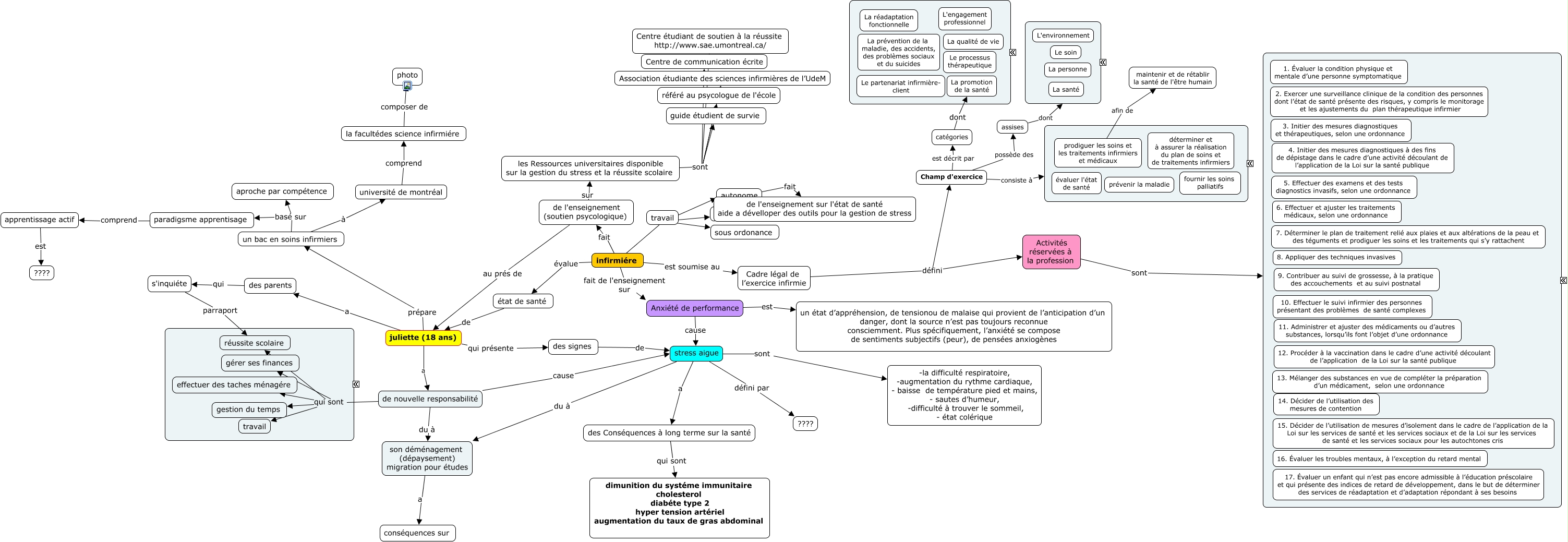 This Concept Map, created with IHMC CmapTools, has information related to: Untitled 1, apprentissage actif est ????, Champ d'exercice possède des assises, prodiguer les soins et les traitements infirmiers et médicaux afin de maintenir et de rétablir la santé de l'être humain, des Conséquences à long terme sur la santé qui sont dimunition du systéme immunitaire cholesterol diabéte type 2 hyper tension artériel augmentation du taux de gras abdominal, infirmiére fait de l'enseignement sur Anxiété de performance, de nouvelle responsabilité qui sont effectuer des taches ménagére, des signes de stress aigue, Cadre légal de l’exercice infirmie défini Champ d'exercice, Activités réservées à la profession sont ????, un bac en soins infirmiers à université de montréal, infirmiére est soumise au Cadre légal de l’exercice infirmie, assises dont ????, infirmiére fait de l'enseignement (soutien psycologique), Anxiété de performance est un état d’appréhension, de tensionou de malaise qui provient de l’anticipation d’un danger, dont la source n’est pas toujours reconnue consciemment. Plus spécifiquement, l’anxiété se compose de sentiments subjectifs (peur), de pensées anxiogènes, infirmiére ???? en colaboration, les Ressources universitaires disponible sur la gestion du stress et la réussite scolaire sont Association étudiante des sciences infirmières de l’UdeM, de l'enseignement (soutien psycologique) au prés de juliette (18 ans), Champ d'exercice est décrit par catégories, Cadre légal de l’exercice infirmie défini Activités réservées à la profession, stress aigue sont -la difficulté respiratoire, -augmentation du rythme cardiaque, - baisse de température pied et mains, - sautes d’humeur, -difficulté à trouver le sommeil, - état colérique