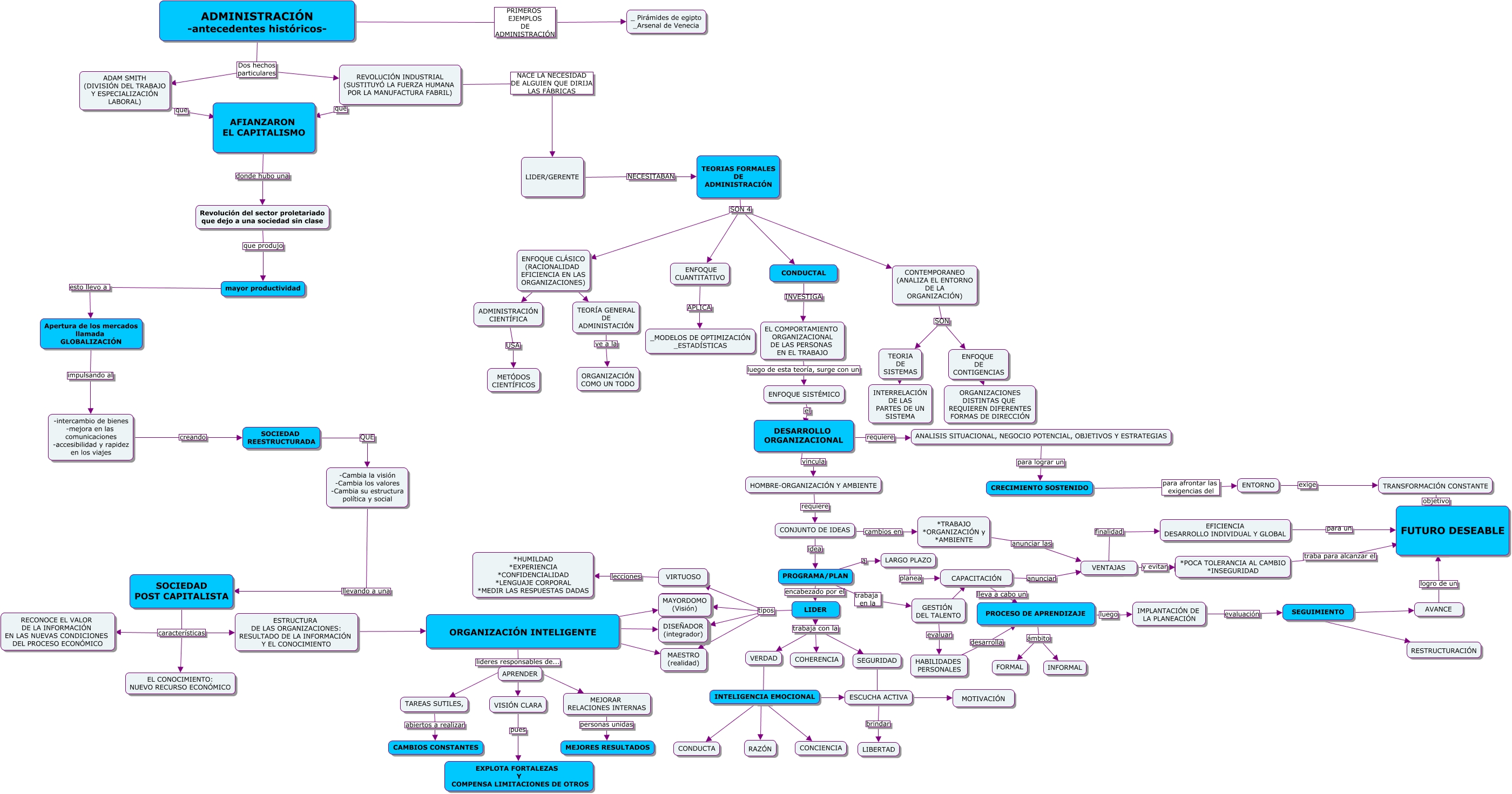 Este Cmap, tiene información relacionada con: GESTIÓN, ORGANIZACIÓN INTELIGENTE ???? DISEÑADOR (integrador), ORGANIZACIÓN INTELIGENTE lideres responsables de... MEJORAR RELACIONES INTERNAS, ANALISIS SITUACIONAL, NEGOCIO POTENCIAL, OBJETIVOS Y ESTRATEGIAS para lograr un CRECIMIENTO SOSTENIDO, LIDER tipos ????, LIDER tipos MAYORDOMO (visión), ORGANIZACIÓN INTELIGENTE ???? MAYORDOMO (Visión), SOCIEDAD REESTRUCTURADA QUE -Cambia la visión -Cambia los valores -Cambia su estructura política y social, AVANCE logro de un ????, ADAM SMITH (DIVISIÓN DEL TRABAJO Y ESPECIALIZACIÓN LABORAL) que ????, CAPACITACIÓN lleva a cabo un PROCESO DE APRENDIZAJE, LARGO PLAZO planea CAPACITACIÓN, SOCIEDAD POST CAPITALISTA características EL CONOCIMIENTO: NUEVO RECURSO ECONÓMICO, ORGANIZACIÓN INTELIGENTE ???? MAESTRO (realidad), TAREAS SUTILES, abiertos a realizar CAMBIOS CONSTANTES, TEORIAS FORMALES DE ADMINISTRACIÓN SON 4 ENFOQUE CUANTITATIVO, IMPLANTACIÓN DE LA PLANEACIÓN evaluación SEGUIMIENTO, LIDER tipos VIRTUOSO, TEORIA DE SISTEMAS ???? INTERRELACIÓN DE LAS PARTES DE UN SISTEMA, PROGRAMA/PLAN a LARGO PLAZO, AFIANZARON EL CAPITALISMO donde hubo una Revolución del sector proletariado que dejo a una sociedad sin clase