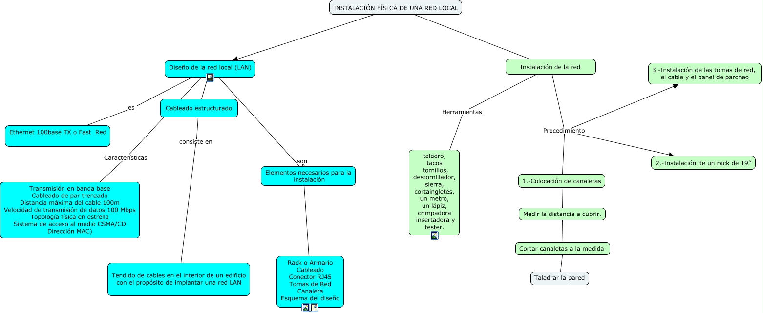 Este Cmap, tiene información relacionada con: Instalacion fisica de red lan, Diseño de la red local (LAN) Elementos necesarios para la instalación, INSTALACIÓN FÍSICA DE UNA RED LOCAL Instalación de la red, Instalación de la red Herramientas taladro, tacos tornillos, destornillador, sierra, cortaingletes, un metro, un lápiz, crimpadora insertadora y tester., Diseño de la red local (LAN) Características Transmisión en banda base Cableado de par trenzado Distancia máxima del cable 100m Velocidad de transmisión de datos 100 Mbps Topología física en estrella Sistema de acceso al medio CSMA/CD Dirección MAC), Instalación de la red Procedimiento 3.-Instalación de las tomas de red, el cable y el panel de parcheo, 1.-Colocación de canaletas Medir la distancia a cubrir., Cableado estructurado consiste en Tendido de cables en el interior de un edificio con el propósito de implantar una red LAN, INSTALACIÓN FÍSICA DE UNA RED LOCAL Diseño de la red local (LAN), Diseño de la red local (LAN) es Ethernet 100base TX o Fast Red, Instalación de la red Procedimiento 1.-Colocación de canaletas, Medir la distancia a cubrir. Cortar canaletas a la medida, Instalación de la red Procedimiento 2.-Instalación de un rack de 19’’, Elementos necesarios para la instalación son Rack o Armario Cableado Conector RJ45 Tomas de Red Canaleta Esquema del diseño, Diseño de la red local (LAN) Cableado estructurado, Cortar canaletas a la medida Taladrar la pared