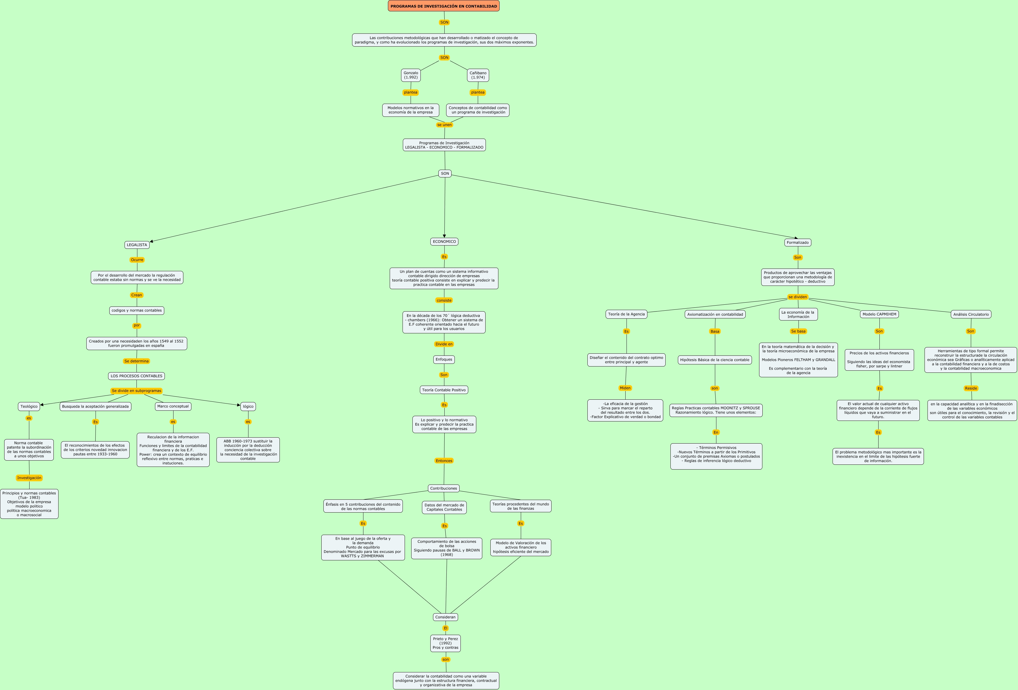 Este Cmap, tiene información relacionada con: PROGRAMAS DE INVESTIGACION EN CONTABILIDAD, codigos y normas contables por Creados por una necesidaden los años 1549 al 1552 fueron promulgadas en españa, SON Formalizado, Herramientas de tipo formal permite reconstruir la estructurade la circulación económica sea Gráficas o analíticamente aplicad a la contabilidad financiera y a la de costos y la contabilidad macroeconomica Reside en la capacidad analítica y en la finadisección de las variables económicos son útiles para el conocimiento, la revisión y el control de las variables contables, Lo positivo y lo normativo Es explicar y predecir la practica contable de las empresas Entonces Contribuciones, Datos del mercado de Capitales Contables Es Comportamiento de las acciones de bolsa Siguiendo pausas de BALL y BROWN (1968), LOS PROCESOS CONTABLES Se divide en subprogramas Busqueda la aceptación generalizada, PROGRAMAS DE INVESTIGACIÓN EN CONTABILIDAD SON Las contribuciones metodológicas que han desarrollado o matizado el concepto de paradigma, y como ha evolucionado los programas de investigación, sus dos máximos exponentes., El valor actual de cualquier activo financiero depende de la corriente de flujos líquidos que vaya a suministrar en el futuro. Es El problema metodológico mas importante es la inexistencia en el limite de las hipótesis fuerte de información., En la década de los 70´ lógica deductiva - chambers (1966): Obtener un sistema de E.F coherente orientado hacia el futuro y útil para los usuarios Divide en Enfoques, ECONOMICO Es Un plan de cuentas como un sistema informativo contable dirigido dirección de empresas teoría contable positiva consiste en explicar y predecir la practica contable en las empresas, Reglas Practicas contables MOONITZ y SPROUSE Razonamiento lógico. Tiene unos elementos: En - Términos Permisivos -Nuevos Términos a partir de los Primitivos -Un conjunto de premisas Axiomas o postulados - Reglas de inferencia lógico deductivo, SON ECONOMICO, Análisis Circulatorio Son Herramientas de tipo formal permite reconstruir la estructurade la circulación económica sea Gráficas o analíticamente aplicad a la contabilidad financiera y a la de costos y la contabilidad macroeconomica, Modelos normativos en la economía de la empresa se unen Programas de Investigación LEGALISTA - ECONOMICO - FORMALIZADO, LEGALISTA Ocurre Por el desarrollo del mercado la regulación contable estaba sin normas y se ve la necesidad, Precios de los activos financieros Siguiendo las ideas del economista fisher, por sarpe y lintner Es El valor actual de cualquier activo financiero depende de la corriente de flujos líquidos que vaya a suministrar en el futuro., Programas de Investigación LEGALISTA - ECONOMICO - FORMALIZADO SON, La economía de la Información Se basa En la teoría matemática de la decisión y la teoría microeconómica de la empresa Modelos Pioneros FELTHAM y GRANDALL Es complementario con la teoría de la agencia, LOS PROCESOS CONTABLES Se divide en subprogramas Teológico, LOS PROCESOS CONTABLES Se divide en subprogramas Marco conceptual