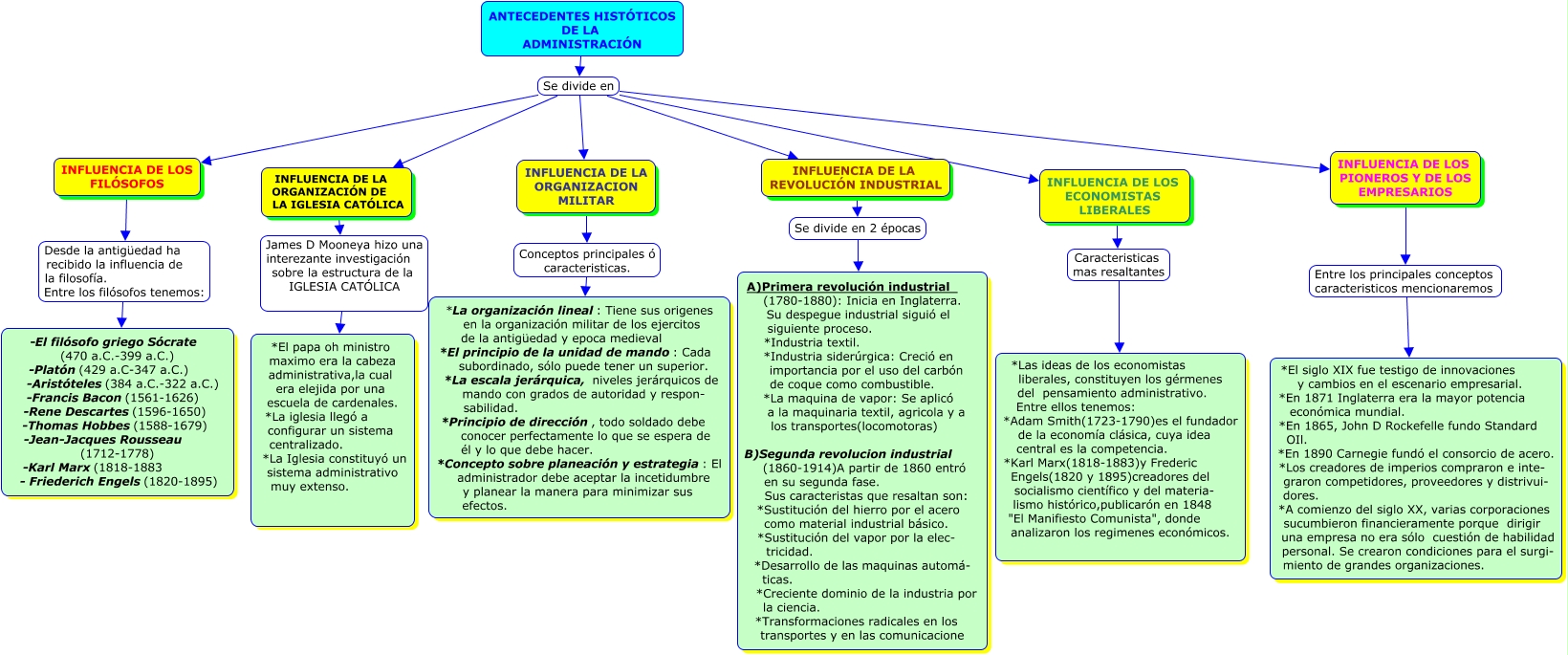 Este Cmap, tiene información relacionada con: chavez sanchez, ANTECEDENTES HISTÓTICOS DE LA ADMINISTRACIÓN Se divide en INFLUENCIA DE LA ORGANIZACIÓN DE LA IGLESIA CATÓLICA, INFLUENCIA DE LA ORGANIZACIÓN DE LA IGLESIA CATÓLICA James D Mooneya hizo una interezante investigación sobre la estructura de la IGLESIA CATÓLICA *El papa oh ministro maximo era la cabeza administrativa,la cual era elejida por una escuela de cardenales. *La iglesia llegó a configurar un sistema centralizado. *La Iglesia constituyó un sistema administrativo muy extenso., INFLUENCIA DE LOS ECONOMISTAS LIBERALES Caracteristicas mas resaltantes *Las ideas de los economistas liberales, constituyen los gérmenes del pensamiento administrativo. Entre ellos tenemos: *Adam Smith(1723-1790)es el fundador de la economía clásica, cuya idea central es la competencia. *Karl Marx(1818-1883)y Frederic Engels(1820 y 1895)creadores del socialismo científico y del materia- lismo histórico,publicarón en 1848 "El Manifiesto Comunista", donde analizaron los regimenes económicos., INFLUENCIA DE LOS FILÓSOFOS Desde la antigüedad ha recibido la influencia de la filosofía. Entre los filósofos tenemos: -El filósofo griego Sócrate (470 a.C.-399 a.C.) -Platón(429 a.C-347 a.C.) -Aristóteles(384 a.C.-322 a.C.) -Francis Bacon(1561-1626) -Rene Descartes(1596-1650) -Thomas Hobbes(1588-1679) -Jean-Jacques Rousseau (1712-1778) -Karl Marx(1818-1883 - Friederich Engels(1820-1895), ANTECEDENTES HISTÓTICOS DE LA ADMINISTRACIÓN Se divide en INFLUENCIA DE LA ORGANIZACION MILITAR, ANTECEDENTES HISTÓTICOS DE LA ADMINISTRACIÓN Se divide en INFLUENCIA DE LOS ECONOMISTAS LIBERALES, INFLUENCIA DE LOS PIONEROS Y DE LOS EMPRESARIOS Entre los principales conceptos caracteristicos mencionaremos *El siglo XIX fue testigo de innovaciones y cambios en el escenario empresarial. *En 1871 Inglaterra era la mayor potencia económica mundial. *En 1865, John D Rockefelle fundo Standard OIl. *En 1890 Carnegie fundó el consorcio de acero. *Los creadores de imperios compraron e inte- graron competidores, proveedores y distrivui- dores. *A comienzo del siglo XX, varias corporaciones sucumbieron financieramente porque dirigir una empresa no era sólo cuestión de habilidad personal. Se crearon condiciones para el surgi- miento de grandes organizaciones., INFLUENCIA DE LA ORGANIZACION MILITAR Conceptos principales ó caracteristicas. *La organización lineal: Tiene sus origenes en la organización militar de los ejercitos de la antigüedad y epoca medieval *El principio de la unidad de mando: Cada subordinado, sólo puede tener un superior. *La escala jerárquica, niveles jerárquicos de mando con grados de autoridad y respon- sabilidad. *Principio de dirección, todo soldado debe conocer perfectamente lo que se espera de él y lo que debe hacer. *Concepto sobre planeación y estrategia: El administrador debe aceptar la incetidumbre y planear la manera para minimizar sus efectos., ANTECEDENTES HISTÓTICOS DE LA ADMINISTRACIÓN Se divide en INFLUENCIA DE LOS PIONEROS Y DE LOS EMPRESARIOS, INFLUENCIA DE LA REVOLUCIÓN INDUSTRIAL Se divide en 2 épocas A)Primera revolución industrial (1780-1880): Inicia en Inglaterra. Su despegue industrial siguió el siguiente proceso. *Industria textil. *Industria siderúrgica: Creció en importancia por el uso del carbón de coque como combustible. *La maquina de vapor: Se aplicó a la maquinaria textil, agricola y a los transportes(locomotoras) B)Segunda revolucion industrial (1860-1914)A partir de 1860 entró en su segunda fase. Sus caracteristas que resaltan son: *Sustitución del hierro por el acero como material industrial básico. *Sustitución del vapor por la elec- tricidad. *Desarrollo de las maquinas automá- ticas. *Creciente dominio de la industria por la ciencia. *Transformaciones radicales en los transportes y en las comunicacione, ANTECEDENTES HISTÓTICOS DE LA ADMINISTRACIÓN Se divide en INFLUENCIA DE LA REVOLUCIÓN INDUSTRIAL, ANTECEDENTES HISTÓTICOS DE LA ADMINISTRACIÓN Se divide en INFLUENCIA DE LOS FILÓSOFOS