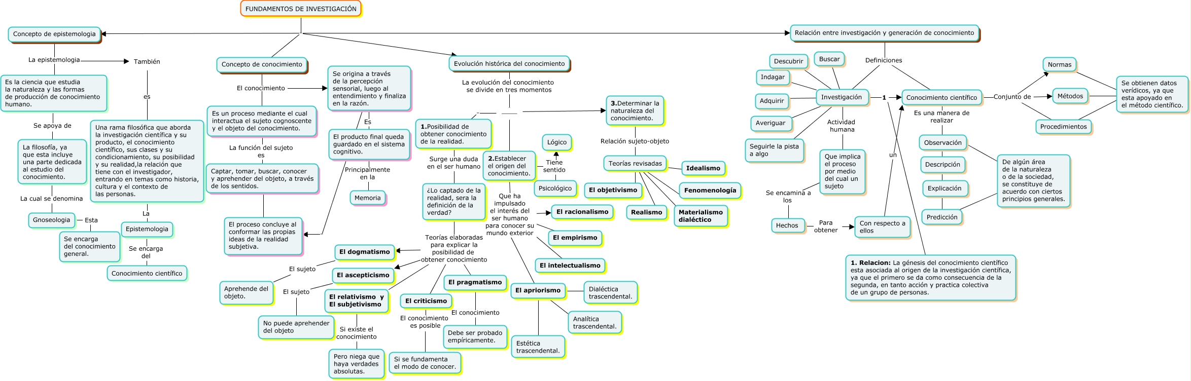 Este Cmap, tiene información relacionada con: FUNDAMENTOS DE INVESTIGACION, Conocimiento científico Conjunto de Métodos, Es la ciencia que estudia la naturaleza y las formas de producción de conocimiento humano. Se apoya de La filosofía, ya que esta incluye una parte dedicada al estudio del conocimiento., El relativismo y El subjetivismo Si existe el conocimiento Pero niega que haya verdades absolutas., 2.Establecer el origen del conocimiento. Tiene sentido Lógico, Que implica el proceso por medio del cual un sujeto Se encamina a los Hechos, ____ . 1.Posibilidad de obtener conocimiento de la realidad., Captar, tomar, buscar, conocer y aprehender del objeto, a través de los sentidos. . El proceso concluye al conformar las propias ideas de la realidad subjetiva., También es Una rama filosófica que aborda la investigación científica y su producto, el conocimiento científico, sus clases y su condicionamiento, su posibilidad y su realidad,la relación que tiene con el investigador, entrando en temas como historia, cultura y el contexto de las personas., 1.Posibilidad de obtener conocimiento de la realidad. Surge una duda en el ser humano ¿Lo captado de la realidad, sera la definición de la verdad?, Observación . De algún área de la naturaleza o de la sociedad, se constituye de acuerdo con ciertos principios generales., Epistemologia Se encarga del Conocimiento científico, Es un proceso mediante el cual interactua el sujeto cognoscente y el objeto del conocimiento. La función del sujeto es Captar, tomar, buscar, conocer y aprehender del objeto, a través de los sentidos., ¿Lo captado de la realidad, sera la definición de la verdad? Teorías elaboradas para explicar la posibilidad de obtener conocimiento El relativismo y El subjetivismo, ¿Lo captado de la realidad, sera la definición de la verdad? Teorías elaboradas para explicar la posibilidad de obtener conocimiento El dogmatismo, ____ . 3.Determinar la naturaleza del conocimiento., FUNDAMENTOS DE INVESTIGACIÓN . Relación entre investigación y generación de conocimiento, Evolución histórica del conocimiento La evolución del conocimiento se divide en tres momentos ____, Investigación . Averiguar, Métodos . Se obtienen datos verídicos, ya que esta apoyado en el método científico., Relación entre investigación y generación de conocimiento Definiciones Conocimiento científico