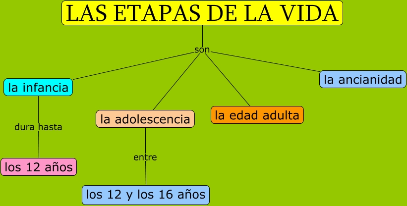 Este Cmap, tiene información relacionada con: Las etapas de la vida, LAS ETAPAS DE LA VIDA son la adolescencia, la infancia dura hasta los 12 años, la adolescencia entre los 12 y los 16 años, LAS ETAPAS DE LA VIDA son la infancia, LAS ETAPAS DE LA VIDA son la edad adulta, LAS ETAPAS DE LA VIDA son la ancianidad