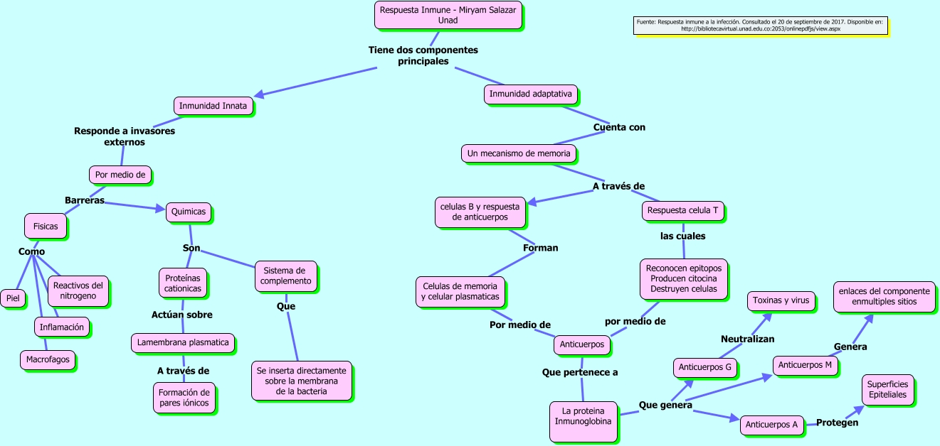 Este Cmap, tiene información relacionada con: Respuesta Inmune Miryam Salazar, Inmunidad adaptativa Cuenta con Un mecanismo de memoria, Lamembrana plasmatica A través de Formación de pares iónicos, Respuesta Inmune - Miryam Salazar Unad Tiene dos componentes principales Inmunidad Innata, Un mecanismo de memoria A través de celulas B y respuesta de anticuerpos, celulas B y respuesta de anticuerpos Forman Celulas de memoria y celular plasmaticas, Un mecanismo de memoria A través de Respuesta celula T, Sistema de complemento Que Se inserta directamente sobre la membrana de la bacteria, Por medio de Barreras Quimicas, Fisicas Como Piel, Celulas de memoria y celular plasmaticas Por medio de Anticuerpos, Quimicas Son Sistema de complemento, Reconocen epitopos Producen citocina Destruyen celulas por medio de Anticuerpos, Anticuerpos Que pertenece a La proteina Inmunoglobina, Inmunidad Innata Responde a invasores externos Por medio de, Fisicas Como Reactivos del nitrogeno, Anticuerpos G Neutralizan Toxinas y virus, La proteina Inmunoglobina Que genera Anticuerpos M, Respuesta Inmune - Miryam Salazar Unad Tiene dos componentes principales Inmunidad adaptativa, Anticuerpos A Protegen Superficies Epiteliales, Anticuerpos M Genera enlaces del componente enmultiples sitios