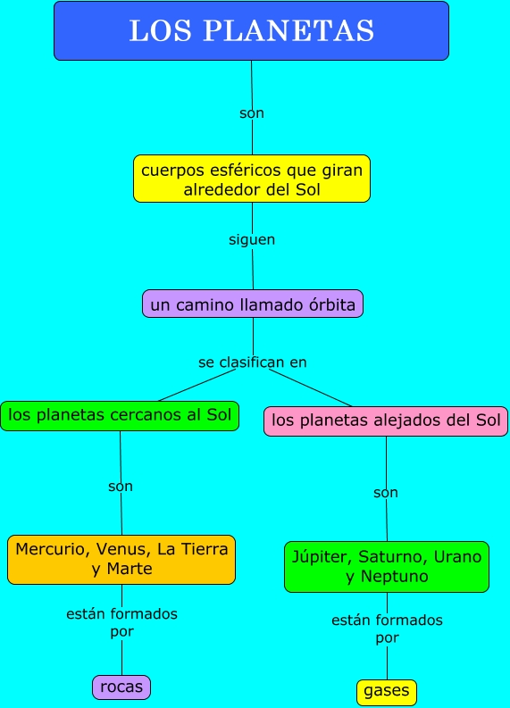 Este Cmap, tiene información relacionada con: Los planetas, un camino llamado órbita se clasifican en los planetas cercanos al Sol, los planetas cercanos al Sol son Mercurio, Venus, La Tierra y Marte, LOS PLANETAS son cuerpos esféricos que giran alrededor del Sol, los planetas alejados del Sol son Júpiter, Saturno, Urano y Neptuno, cuerpos esféricos que giran alrededor del Sol siguen un camino llamado órbita, un camino llamado órbita se clasifican en los planetas alejados del Sol, Júpiter, Saturno, Urano y Neptuno están formados por gases, Mercurio, Venus, La Tierra y Marte están formados por rocas