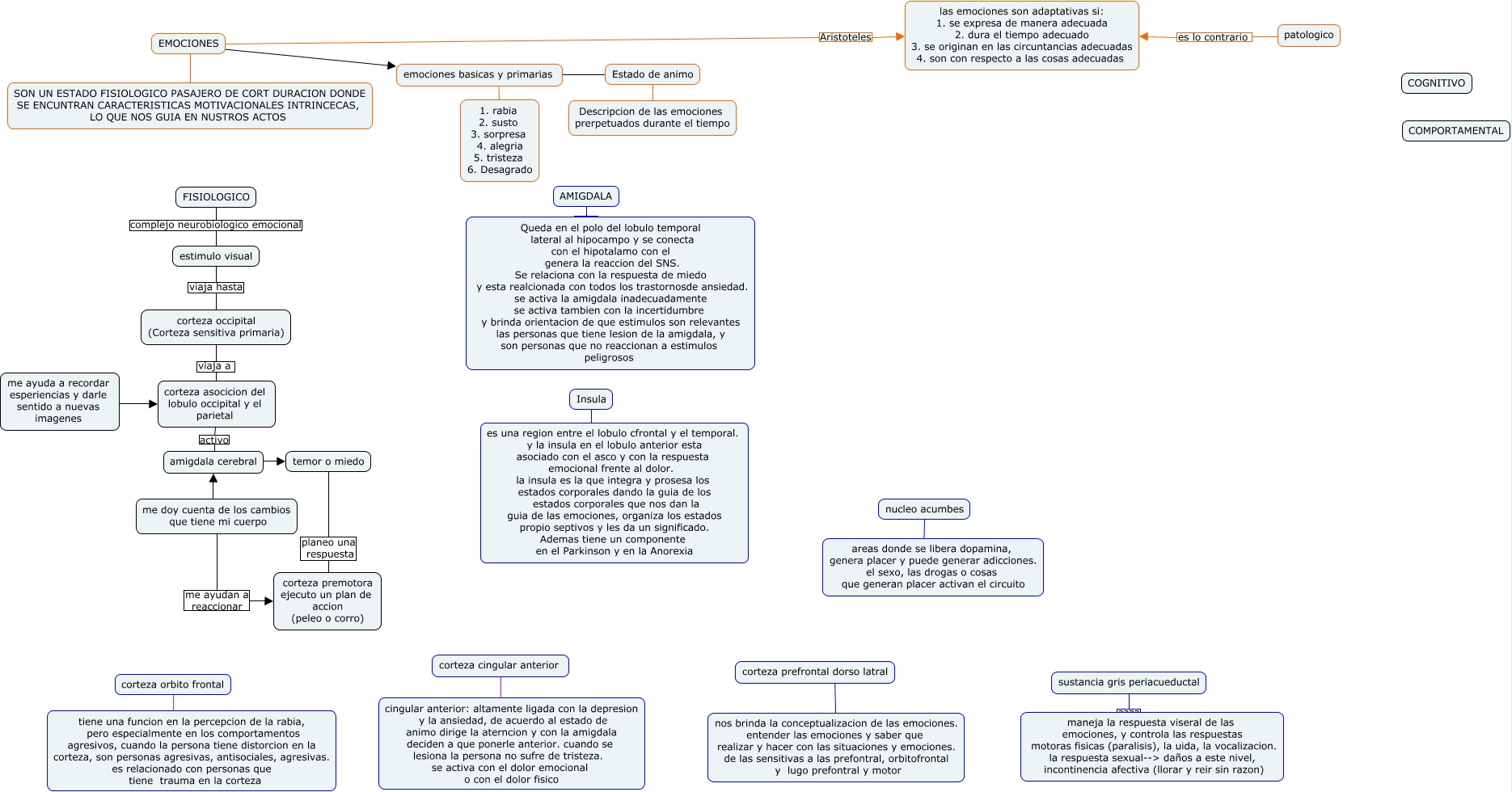Este Cmap, tiene información relacionada con: clase, emociones basicas y primarias ???? 1. rabia 2. susto 3. sorpresa 4. alegria 5. tristeza 6. Desagrado, EMOCIONES Aristoteles las emociones son adaptativas si: 1. se expresa de manera adecuada 2. dura el tiempo adecuado 3. se originan en las circuntancias adecuadas 4. son con respecto a las cosas adecuadas, AMIGDALA ???? Queda en el polo del lobulo temporal lateral al hipocampo y se conecta con el hipotalamo con el genera la reaccion del SNS. Se relaciona con la respuesta de miedo y esta realcionada con todos los trastornosde ansiedad. se activa la amigdala inadecuadamente se activa tambien con la incertidumbre y brinda orientacion de que estimulos son relevantes las personas que tiene lesion de la amigdala, y son personas que no reaccionan a estimulos peligrosos, nucleo acumbes ???? areas donde se libera dopamina, genera placer y puede generar adicciones. el sexo, las drogas o cosas que generan placer activan el circuito, me ayuda a recordar esperiencias y darle sentido a nuevas imagenes ???? corteza asocicion del lobulo occipital y el parietal, corteza prefrontal dorso latral ???? nos brinda la conceptualizacion de las emociones. entender las emociones y saber que realizar y hacer con las situaciones y emociones. de las sensitivas a las prefontral, orbitofrontal y lugo prefontral y motor, amigdala cerebral ???? temor o miedo, estimulo visual viaja hasta corteza occipital (Corteza sensitiva primaria), Estado de animo ???? Descripcion de las emociones prerpetuados durante el tiempo, FISIOLOGICO complejo neurobiologico emocional estimulo visual, corteza asocicion del lobulo occipital y el parietal activo amigdala cerebral, sustancia gris periacueductal ???? maneja la respuesta viseral de las emociones, y controla las respuestas motoras fisicas (paralisis), la uida, la vocalizacion. la respuesta sexual--> daños a este nivel, incontinencia afectiva (llorar y reir sin razon), me doy cuenta de los cambios que tiene mi cuerpo ???? amigdala cerebral, EMOCIONES ???? emociones basicas y primarias, emociones basicas y primarias ???? Estado de animo, me doy cuenta de los cambios que tiene mi cuerpo me ayudan a reaccionar corteza premotora ejecuto un plan de accion (peleo o corro), Insula ???? es una region entre el lobulo cfrontal y el temporal. y la insula en el lobulo anterior esta asociado con el asco y con la respuesta emocional frente al dolor. la insula es la que integra y prosesa los estados corporales dando la guia de los estados corporales que nos dan la guia de las emociones, organiza los estados propio septivos y les da un significado. Ademas tiene un componente en el Parkinson y en la Anorexia, EMOCIONES ???? SON UN ESTADO FISIOLOGICO PASAJERO DE CORT DURACION DONDE SE ENCUNTRAN CARACTERISTICAS MOTIVACIONALES INTRINCECAS, LO QUE NOS GUIA EN NUSTROS ACTOS, patologico es lo contrario las emociones son adaptativas si: 1. se expresa de manera adecuada 2. dura el tiempo adecuado 3. se originan en las circuntancias adecuadas 4. son con respecto a las cosas adecuadas, corteza occipital (Corteza sensitiva primaria) viaja a corteza asocicion del lobulo occipital y el parietal