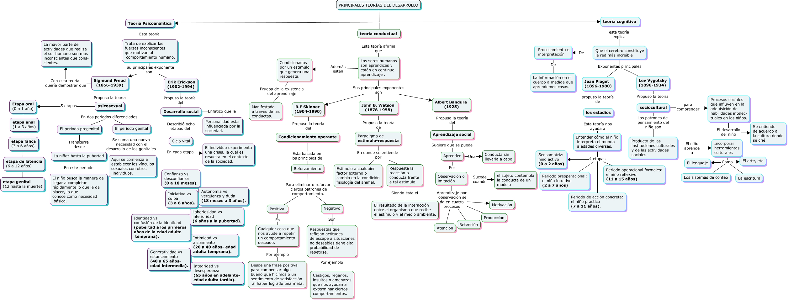 Este Cmap, tiene información relacionada con: Principales teorias del desarrollo, Observación o imitación Aprendizaje por observación se da en cuatro procesos Producción, El periodo pregenital Transcurre desde La niñez hasta la pubertad, los estadios Esta teoría nos ayuda a Entender cómo el niño interpreta el mundo a edades diversas., John B. Watson (1878-1958) Propuso la teoría de Paradigma de estimulo-respuesta, Erik Erickson (1902-1994) Propuso la teoría del Desarrollo social, Paradigma de estimulo-respuesta En donde se entiende por Estimulo a cualquier factor externo o cambio en la condición fisiología del animal., Aprender Por Observación o imitación, psicosexual 5 etapas Etapa oral (0 a 1 año), sociocultural Los patrones de pensamiento del niño son Producto de las instituciones culturales y de las actividades sociales., Sigmund Freud (1856-1939) Con esta teoría quería demostrar que La mayor parte de actividades que realiza el ser humano son mas inconscientes que cons- cientes., Entender cómo el niño interpreta el mundo a edades diversas. 4 etapas Periodo preoperacional: el niño intuitivo (2 a 7 años), Trata de explicar las fuerzas inconscientes que motivan al comportamiento humano. Su principales exponente son Erik Erickson (1902-1994), Entender cómo el niño interpreta el mundo a edades diversas. 4 etapas Periodo de acción concreta: el niño practico (7 a 11 años)., Trata de explicar las fuerzas inconscientes que motivan al comportamiento humano. Su principales exponente son Sigmund Freud (1856-1939), Observación o imitación Aprendizaje por observación se da en cuatro procesos Retención, Producto de las instituciones culturales y de las actividades sociales. El niño aprende a Incorporar herramientas culturales, Incorporar herramientas culturales Como Los sistemas de conteo, Reforzamiento Para eliminar o reforzar ciertos patrones de comportamiento. Positiva, Ciclo vital En cada etapa El individuo experimenta una crisis, la cual es resuelta en el contexto de la sociedad., PRINCIPALES TEORÍAS DEL DESARROLLO . teoría conductual