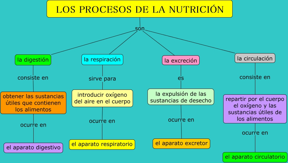Este Cmap, tiene información relacionada con: Los procesos de la nutrición, LOS PROCESOS DE LA NUTRICIÓN son la excreción, LOS PROCESOS DE LA NUTRICIÓN son la respiración, la circulación consiste en repartir por el cuerpo el oxígeno y las sustancias útiles de los alimentos, LOS PROCESOS DE LA NUTRICIÓN son la circulación, la digestión consiste en obtener las sustancias útiles que contienen los alimentos, la excreción es la expulsión de las sustancias de desecho, introducir oxígeno del aire en el cuerpo ocurre en el aparato respiratorio, la expulsión de las sustancias de desecho ocurre en el aparato excretor, repartir por el cuerpo el oxígeno y las sustancias útiles de los alimentos ocurre en el aparato circulatorio, LOS PROCESOS DE LA NUTRICIÓN son la digestión, la respiración sirve para introducir oxígeno del aire en el cuerpo, obtener las sustancias útiles que contienen los alimentos ocurre en el aparato digestivo