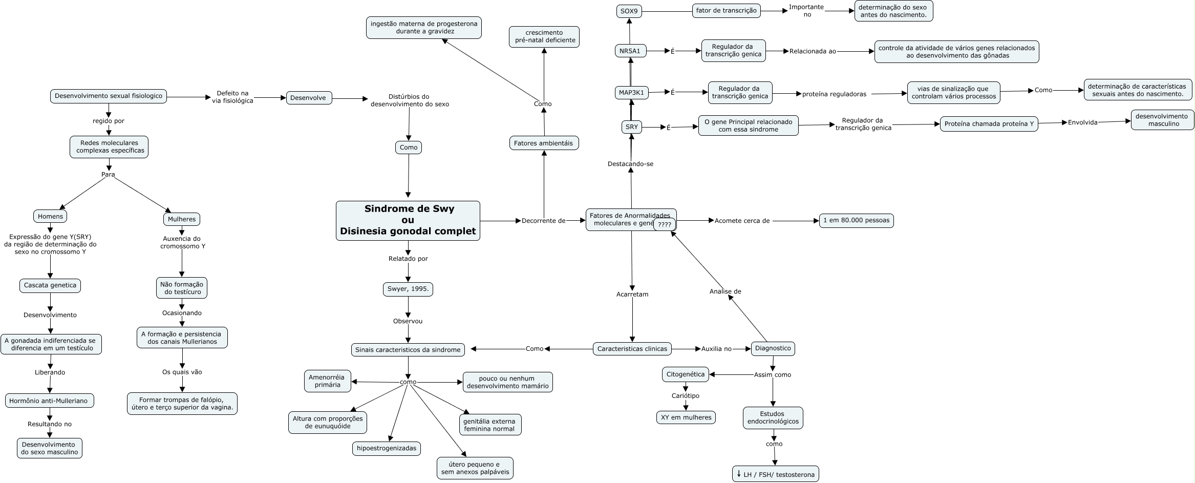 Esse mapa conceitual, produzido no IHMC CmapTools, tem a informação relacionada a: Sindrome de Swy, Citogenética Cariótipo XY em mulheres, A formação e persistencia dos canais Mullerianos Os quais vão Formar trompas de falópio, útero e terço superior da vagina., NR5A1 É Regulador da transcrição genica, vias de sinalização que controlam vários processos Como determinação de características sexuais antes do nascimento., Diagnostico Assim como Estudos endocrinológicos, Sindrome de Swy ou Disinesia gonodal complet Decorrente de Fatores de Anormalidades moleculares e genéticas, Proteína chamada proteína Y Envolvida desenvolvimento masculino, Regulador da transcrição genica Relacionada ao controle da atividade de vários genes relacionados ao desenvolvimento das gônadas, Cascata genetica Desenvolvimento A gonadada indiferenciada se diferencia em um testículo, Regulador da transcrição genica proteína reguladoras vias de sinalização que controlam vários processos, Fatores de Anormalidades moleculares e genéticas Destacando-se NR5A1, Fatores ambientáis Como ingestão materna de progesterona durante a gravidez, Como ????, Caracteristicas clinicas Auxilia no Diagnostico, fator de transcrição Importante no determinação do sexo antes do nascimento., Fatores de Anormalidades moleculares e genéticas Destacando-se MAP3K1, SOX9 É fator de transcrição, Hormônio anti-Mulleriano Resultando no Desenvolvimento do sexo masculino, Sinais caracteristicos da sindrome como Amenorréia primária, SRY É O gene Principal relacionado com essa sindrome