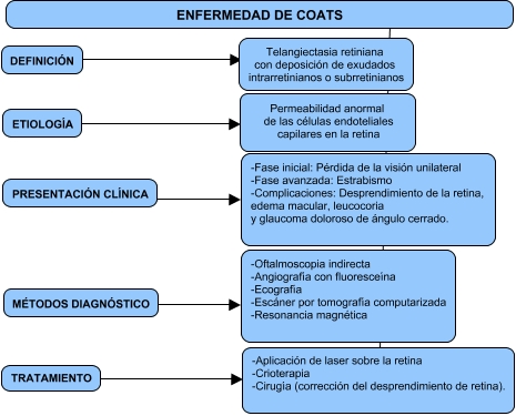 Este Cmap, tiene información relacionada con: ENFERMEDAD DE COATS, MÉTODOS DIAGNÓSTICO ???? - Oftalmoscopia indirecta - Angiografía con fluoresceína - Ecografía - Escáner por tomografía computarizada - Resonancia magnética, ETIOLOGÍA ???? ????, PRESENTACIÓN CLÍNICA ???? - Fase inicial: Pérdida de la visión unilateral - Fase avanzada: Estrabismo - Complicaciones: Desprendimiento de la retina, edema macular, leucocoria y glaucoma doloroso de ángulo cerrado., DEFINICIÓN ???? ????, TRATAMIENTO ???? - Aplicación de laser sobre la retina - Crioterapia - Cirugía (corrección del desprendimiento de retina)., ENFERMEDAD DE COATS ???? - Aplicación de laser sobre la retina - Crioterapia - Cirugía (corrección del desprendimiento de retina).
