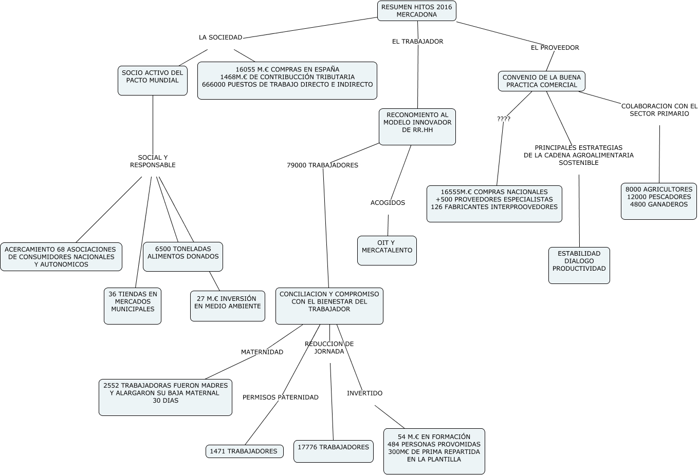 Este Cmap, tiene información relacionada con: RSC MERCADONA, SOCIO ACTIVO DEL PACTO MUNDIAL SOCIAL Y RESPONSABLE 36 TIENDAS EN MERCADOS MUNICIPALES, CONCILIACION Y COMPROMISO CON EL BIENESTAR DEL TRABAJADOR MATERNIDAD 2552 TRABAJADORAS FUERON MADRES Y ALARGARON SU BAJA MATERNAL 30 DIAS, RECONOMIENTO AL MODELO INNOVADOR DE RR.HH 79000 TRABAJADORES CONCILIACION Y COMPROMISO CON EL BIENESTAR DEL TRABAJADOR, CONCILIACION Y COMPROMISO CON EL BIENESTAR DEL TRABAJADOR PERMISOS PATERNIDAD 1471 TRABAJADORES, SOCIO ACTIVO DEL PACTO MUNDIAL SOCIAL Y RESPONSABLE ACERCAMIENTO 68 ASOCIACIONES DE CONSUMIDORES NACIONALES Y AUTONOMICOS, SOCIO ACTIVO DEL PACTO MUNDIAL SOCIAL Y RESPONSABLE 6500 TONELADAS ALIMENTOS DONADOS, RESUMEN HITOS 2016 MERCADONA EL PROVEEDOR CONVENIO DE LA BUENA PRACTICA COMERCIAL, CONVENIO DE LA BUENA PRACTICA COMERCIAL COLABORACION CON EL SECTOR PRIMARIO 8000 AGRICULTORES 12000 PESCADORES 4800 GANADEROS, RESUMEN HITOS 2016 MERCADONA EL TRABAJADOR RECONOMIENTO AL MODELO INNOVADOR DE RR.HH, SOCIO ACTIVO DEL PACTO MUNDIAL SOCIAL Y RESPONSABLE 27 M.€ INVERSIÓN EN MEDIO AMBIENTE, CONCILIACION Y COMPROMISO CON EL BIENESTAR DEL TRABAJADOR REDUCCION DE JORNADA 17776 TRABAJADORES, RESUMEN HITOS 2016 MERCADONA LA SOCIEDAD 16055 M.€ COMPRAS EN ESPAÑA 1468M.€ DE CONTRIBUCCIÓN TRIBUTARIA 666000 PUESTOS DE TRABAJO DIRECTO E INDIRECTO, CONCILIACION Y COMPROMISO CON EL BIENESTAR DEL TRABAJADOR INVERTIDO 54 M.€ EN FORMACIÓN 484 PERSONAS PROVOMIDAS 300M€ DE PRIMA REPARTIDA EN LA PLANTILLA, CONVENIO DE LA BUENA PRACTICA COMERCIAL PRINCIPALES ESTRATEGIAS DE LA CADENA AGROALIMENTARIA SOSTENIBLE ESTABILIDAD DIALOGO PRODUCTIVIDAD, RESUMEN HITOS 2016 MERCADONA LA SOCIEDAD SOCIO ACTIVO DEL PACTO MUNDIAL, CONVENIO DE LA BUENA PRACTICA COMERCIAL ???? 16555M.€ COMPRAS NACIONALES +500 PROVEEDORES ESPECIALISTAS 126 FABRICANTES INTERPROOVEDORES, RECONOMIENTO AL MODELO INNOVADOR DE RR.HH ACOGIDOS OIT Y MERCATALENTO