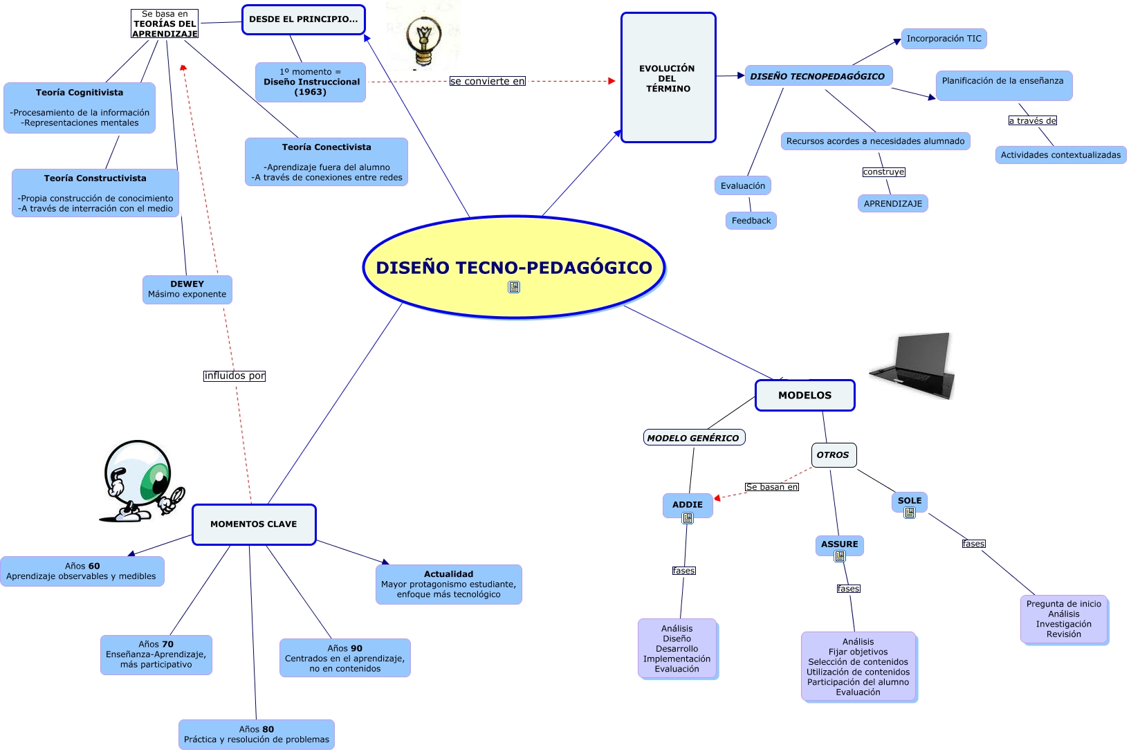 Este Cmap, tiene información relacionada con: DISEÑO TECNOPEDAGOGICO, MODELOS ???? ASSURE, DISEÑO TECNO-PEDAGÓGICO ???? DESDE EL PRINCIPIO..., DISEÑO TECNOPEDAGÓGICO ???? Recursos acordes a necesidades alumnado, DESDE EL PRINCIPIO... ???? 1º momento = Diseño Instruccional (1963), SOLE fases Pregunta de inicio Análisis Investigación Revisión, MOMENTOS CLAVE ???? Años 90 Centrados en el aprendizaje, no en contenidos, DISEÑO TECNO-PEDAGÓGICO ???? MOMENTOS CLAVE, DESDE EL PRINCIPIO... Se basa en TEORÍAS DEL APRENDIZAJE Teoría Cognitivista -Procesamiento de la información -Representaciones mentales, Evaluación ???? Feedback, OTROS ???? SOLE, Recursos acordes a necesidades alumnado construye APRENDIZAJE, DISEÑO TECNO-PEDAGÓGICO ???? MODELOS, ASSURE fases Análisis Fijar objetivos Selección de contenidos Utilización de contenidos Participación del alumno Evaluación, DESDE EL PRINCIPIO... Se basa en TEORÍAS DEL APRENDIZAJE Teoría Constructivista -Propia construcción de conocimiento -A través de interración con el medio, DESDE EL PRINCIPIO... Se basa en TEORÍAS DEL APRENDIZAJE DEWEY Másimo exponente, MOMENTOS CLAVE ???? Años 60 Aprendizaje observables y medibles, DISEÑO TECNOPEDAGÓGICO ???? Planificación de la enseñanza, ADDIE fases Análisis Diseño Desarrollo Implementación Evaluación, OTROS Se basan en ADDIE, EVOLUCIÓN DEL TÉRMINO ???? DISEÑO TECNOPEDAGÓGICO