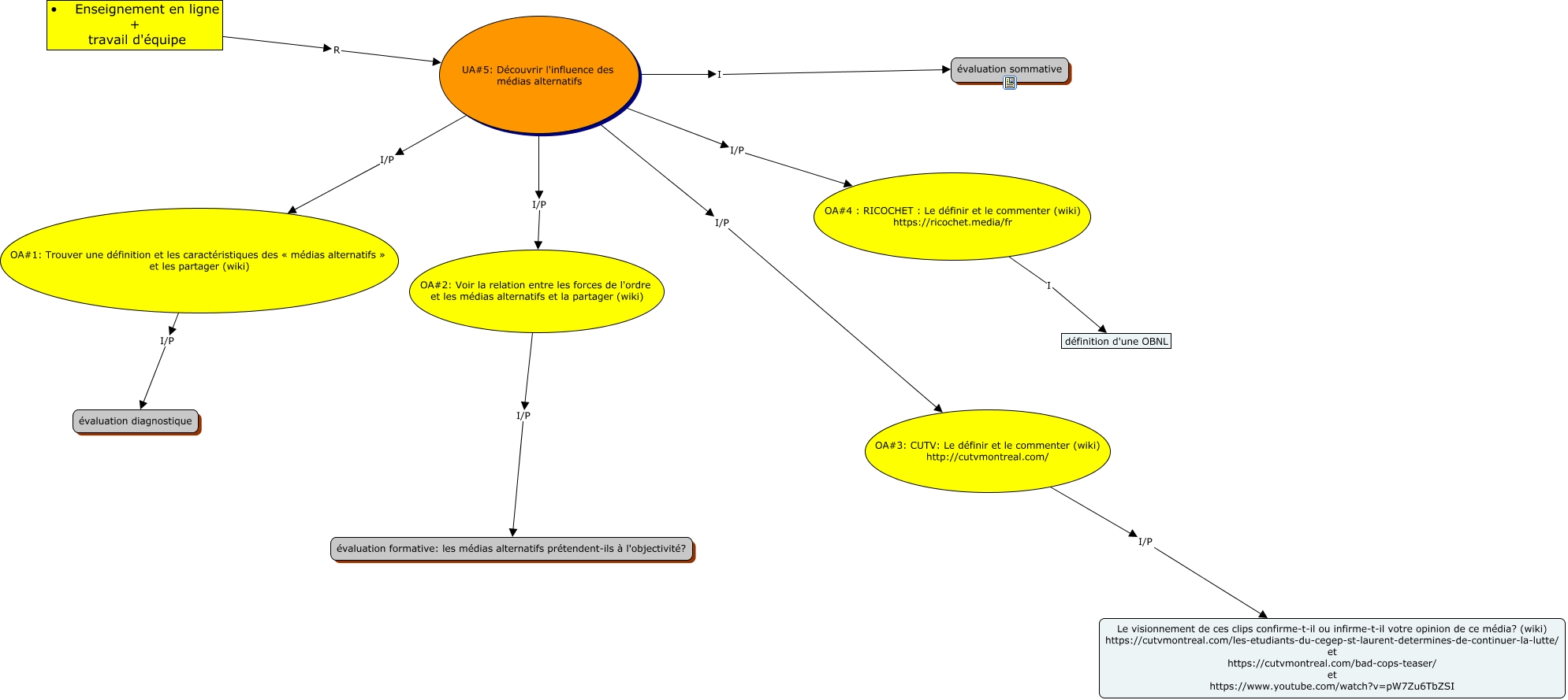 This Concept Map, created with IHMC CmapTools, has information related to: UA5, OA#3: CUTV: Le définir et le commenter (wiki) http://cutvmontreal.com/ I/P Le visionnement de ces clips confirme-t-il ou infirme-t-il votre opinion de ce média? (wiki) https://cutvmontreal.com/les-etudiants-du-cegep-st-laurent-determines-de-continuer-la-lutte/ et https://cutvmontreal.com/bad-cops-teaser/ et https://www.youtube.com/watch?v=pW7Zu6TbZSI, UA#5: Découvrir l'influence des médias alternatifs I évaluation sommative, UA#5: Découvrir l'influence des médias alternatifs I/P OA#1: Trouver une définition et les caractéristiques des « médias alternatifs » et les partager (wiki), UA#5: Découvrir l'influence des médias alternatifs I/P OA#4 : RICOCHET : Le définir et le commenter (wiki) https://ricochet.media/fr, UA#5: Découvrir l'influence des médias alternatifs I/P OA#2: Voir la relation entre les forces de l'ordre et les médias alternatifs et la partager (wiki), OA#2: Voir la relation entre les forces de l'ordre et les médias alternatifs et la partager (wiki) I/P évaluation formative: les médias alternatifs prétendent-ils à l'objectivité?, • Enseignement en ligne + travail d'équipe R UA#5: Découvrir l'influence des médias alternatifs, OA#1: Trouver une définition et les caractéristiques des « médias alternatifs » et les partager (wiki) I/P évaluation diagnostique, UA#5: Découvrir l'influence des médias alternatifs I/P OA#3: CUTV: Le définir et le commenter (wiki) http://cutvmontreal.com/
