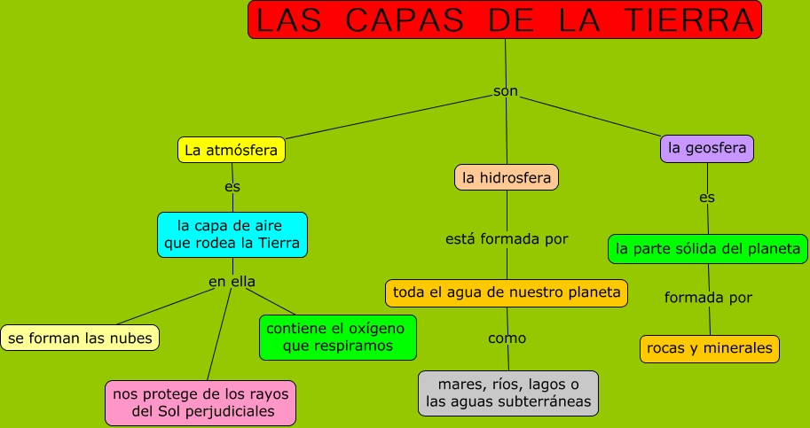 Este Cmap, tiene información relacionada con: Las capas de la Tierra, la hidrosfera está formada por toda el agua de nuestro planeta, LAS CAPAS DE LA TIERRA son La atmósfera, la parte sólida del planeta formada por rocas y minerales, la capa de aire que rodea la Tierra en ella contiene el oxígeno que respiramos, LAS CAPAS DE LA TIERRA son la hidrosfera, la geosfera es la parte sólida del planeta, toda el agua de nuestro planeta como mares, ríos, lagos o las aguas subterráneas, LAS CAPAS DE LA TIERRA son la geosfera, la capa de aire que rodea la Tierra en ella se forman las nubes, la capa de aire que rodea la Tierra en ella nos protege de los rayos del Sol perjudiciales, La atmósfera es la capa de aire que rodea la Tierra
