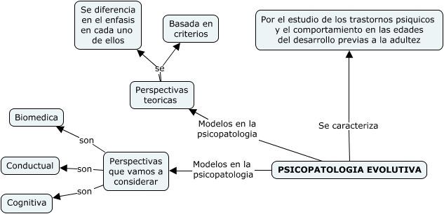 Este Cmap, tiene información relacionada con: Psicopatologia Evolutiva, PSICOPATOLOGIA EVOLUTIVA Modelos en la psicopatologia Perspectivas teoricas, PSICOPATOLOGIA EVOLUTIVA Se caracteriza Por el estudio de los trastornos psiquicos y el comportamiento en las edades del desarrollo previas a la adultez, Perspectivas que vamos a considerar son Biomedica, Perspectivas teoricas se Basada en criterios, Perspectivas que vamos a considerar son Cognitiva, Perspectivas teoricas Se diferencia en el enfasis en cada uno de ellos, Perspectivas que vamos a considerar son Conductual, PSICOPATOLOGIA EVOLUTIVA Modelos en la psicopatologia Perspectivas que vamos a considerar