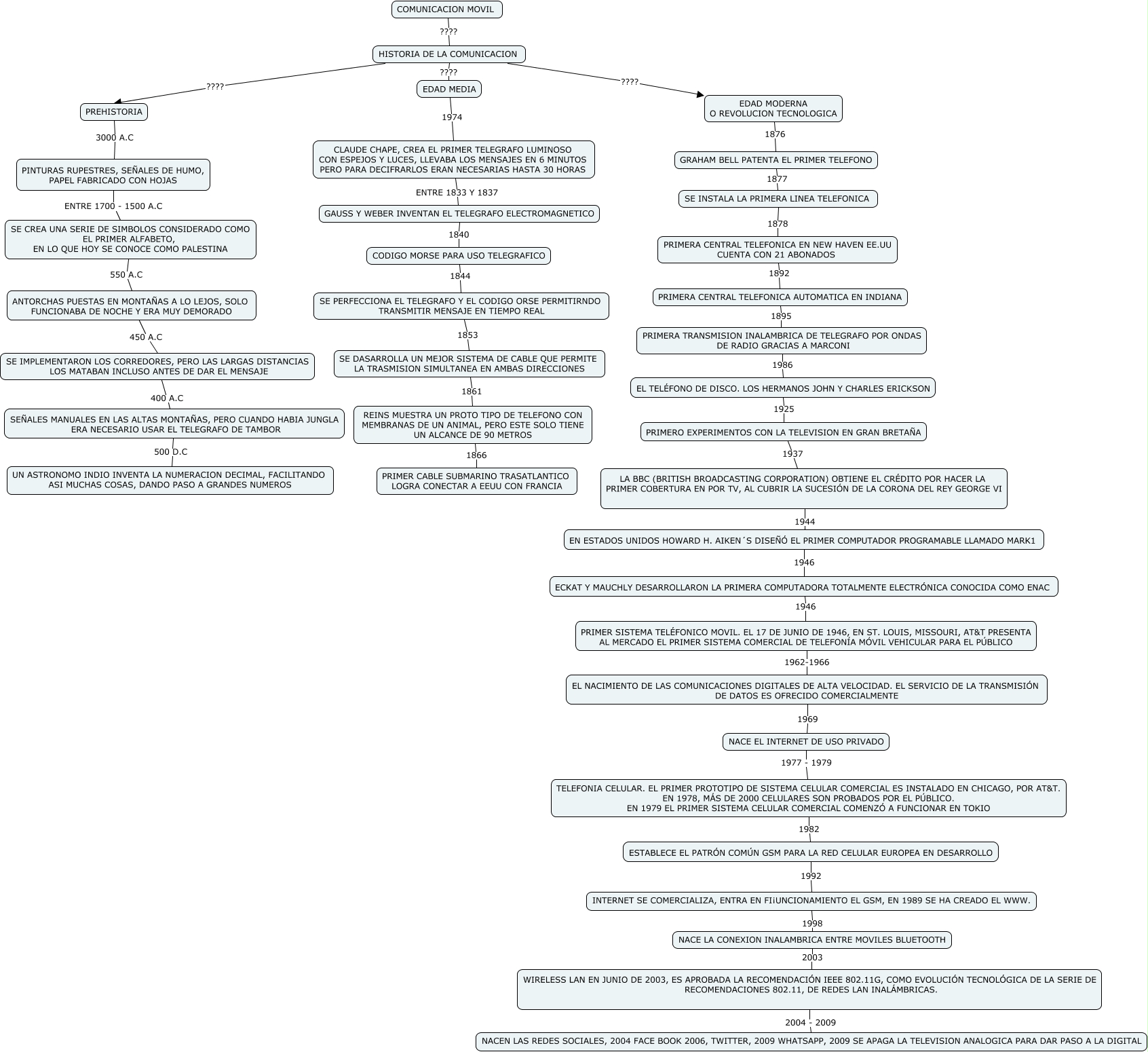Este Cmap, tiene información relacionada con: COMUNICACION MOVIL, SE PERFECCIONA EL TELEGRAFO Y EL CODIGO ORSE PERMITIRNDO TRANSMITIR MENSAJE EN TIEMPO REAL 1853 SE DASARROLLA UN MEJOR SISTEMA DE CABLE QUE PERMITE LA TRASMISION SIMULTANEA EN AMBAS DIRECCIONES, EL TELÉFONO DE DISCO. LOS HERMANOS JOHN Y CHARLES ERICKSON 1925 PRIMERO EXPERIMENTOS CON LA TELEVISION EN GRAN BRETAÑA, ESTABLECE EL PATRÓN COMÚN GSM PARA LA RED CELULAR EUROPEA EN DESARROLLO 1992 INTERNET SE COMERCIALIZA, ENTRA EN FI¡UNCIONAMIENTO EL GSM, EN 1989 SE HA CREADO EL WWW., PRIMERA CENTRAL TELEFONICA AUTOMATICA EN INDIANA 1895 PRIMERA TRANSMISION INALAMBRICA DE TELEGRAFO POR ONDAS DE RADIO GRACIAS A MARCONI, GRAHAM BELL PATENTA EL PRIMER TELEFONO 1877 SE INSTALA LA PRIMERA LINEA TELEFONICA, NACE EL INTERNET DE USO PRIVADO 1977 - 1979 TELEFONIA CELULAR. EL PRIMER PROTOTIPO DE SISTEMA CELULAR COMERCIAL ES INSTALADO EN CHICAGO, POR AT&T. EN 1978, MÁS DE 2000 CELULARES SON PROBADOS POR EL PÚBLICO. EN 1979 EL PRIMER SISTEMA CELULAR COMERCIAL COMENZÓ A FUNCIONAR EN TOKIO, PRIMERA TRANSMISION INALAMBRICA DE TELEGRAFO POR ONDAS DE RADIO GRACIAS A MARCONI 1986 EL TELÉFONO DE DISCO. LOS HERMANOS JOHN Y CHARLES ERICKSON, SE IMPLEMENTARON LOS CORREDORES, PERO LAS LARGAS DISTANCIAS LOS MATABAN INCLUSO ANTES DE DAR EL MENSAJE 400 A.C SEÑALES MANUALES EN LAS ALTAS MONTAÑAS, PERO CUANDO HABIA JUNGLA ERA NECESARIO USAR EL TELEGRAFO DE TAMBOR, CLAUDE CHAPE, CREA EL PRIMER TELEGRAFO LUMINOSO CON ESPEJOS Y LUCES, LLEVABA LOS MENSAJES EN 6 MINUTOS PERO PARA DECIFRARLOS ERAN NECESARIAS HASTA 30 HORAS ENTRE 1833 Y 1837 GAUSS Y WEBER INVENTAN EL TELEGRAFO ELECTROMAGNETICO, WIRELESS LAN EN JUNIO DE 2003, ES APROBADA LA RECOMENDACIÓN IEEE 802.11G, COMO EVOLUCIÓN TECNOLÓGICA DE LA SERIE DE RECOMENDACIONES 802.11, DE REDES LAN INALÁMBRICAS. 2004 - 2009 NACEN LAS REDES SOCIALES, 2004 FACE BOOK 2006, TWITTER, 2009 WHATSAPP, 2009 SE APAGA LA TELEVISION ANALOGICA PARA DAR PASO A LA DIGITAL, EDAD MEDIA 1974 CLAUDE CHAPE, CREA EL PRIMER TELEGRAFO LUMINOSO CON ESPEJOS Y LUCES, LLEVABA LOS MENSAJES EN 6 MINUTOS PERO PARA DECIFRARLOS ERAN NECESARIAS HASTA 30 HORAS, EDAD MODERNA O REVOLUCION TECNOLOGICA 1876 GRAHAM BELL PATENTA EL PRIMER TELEFONO, SEÑALES MANUALES EN LAS ALTAS MONTAÑAS, PERO CUANDO HABIA JUNGLA ERA NECESARIO USAR EL TELEGRAFO DE TAMBOR 500 D.C UN ASTRONOMO INDIO INVENTA LA NUMERACION DECIMAL, FACILITANDO ASI MUCHAS COSAS, DANDO PASO A GRANDES NUMEROS, SE DASARROLLA UN MEJOR SISTEMA DE CABLE QUE PERMITE LA TRASMISION SIMULTANEA EN AMBAS DIRECCIONES 1861 REINS MUESTRA UN PROTO TIPO DE TELEFONO CON MEMBRANAS DE UN ANIMAL, PERO ESTE SOLO TIENE UN ALCANCE DE 90 METROS, EN ESTADOS UNIDOS HOWARD H. AIKEN´S DISEÑÓ EL PRIMER COMPUTADOR PROGRAMABLE LLAMADO MARK1 1946 ECKAT Y MAUCHLY DESARROLLARON LA PRIMERA COMPUTADORA TOTALMENTE ELECTRÓNICA CONOCIDA COMO ENAC, PRIMER SISTEMA TELÉFONICO MOVIL. EL 17 DE JUNIO DE 1946, EN ST. LOUIS, MISSOURI, AT&T PRESENTA AL MERCADO EL PRIMER SISTEMA COMERCIAL DE TELEFONÍA MÓVIL VEHICULAR PARA EL PÚBLICO 1962-1966 EL NACIMIENTO DE LAS COMUNICACIONES DIGITALES DE ALTA VELOCIDAD. EL SERVICIO DE LA TRANSMISIÓN DE DATOS ES OFRECIDO COMERCIALMENTE, LA BBC (BRITISH BROADCASTING CORPORATION) OBTIENE EL CRÉDITO POR HACER LA PRIMER COBERTURA EN POR TV, AL CUBRIR LA SUCESIÓN DE LA CORONA DEL REY GEORGE VI 1944 EN ESTADOS UNIDOS HOWARD H. AIKEN´S DISEÑÓ EL PRIMER COMPUTADOR PROGRAMABLE LLAMADO MARK1, ECKAT Y MAUCHLY DESARROLLARON LA PRIMERA COMPUTADORA TOTALMENTE ELECTRÓNICA CONOCIDA COMO ENAC 1946 PRIMER SISTEMA TELÉFONICO MOVIL. EL 17 DE JUNIO DE 1946, EN ST. LOUIS, MISSOURI, AT&T PRESENTA AL MERCADO EL PRIMER SISTEMA COMERCIAL DE TELEFONÍA MÓVIL VEHICULAR PARA EL PÚBLICO, PRIMERA CENTRAL TELEFONICA EN NEW HAVEN EE.UU CUENTA CON 21 ABONADOS 1892 PRIMERA CENTRAL TELEFONICA AUTOMATICA EN INDIANA, HISTORIA DE LA COMUNICACION ???? EDAD MODERNA O REVOLUCION TECNOLOGICA