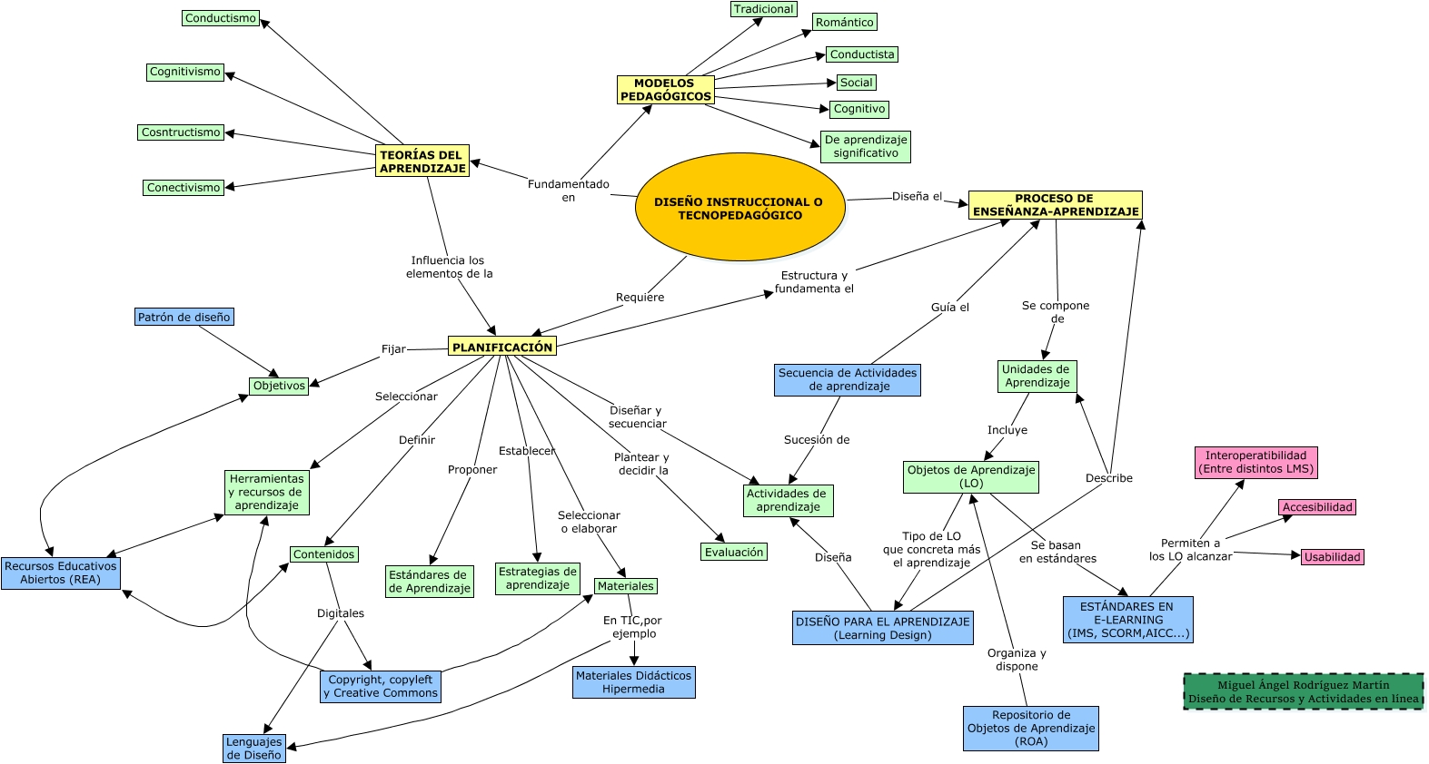 Este Cmap, tiene información relacionada con: DISEÑO INSTRUCCIONAL O TECNOPEDAGÓGICO - Miguel Ángel Rodríguez Martín, Materiales En TIC,por ejemplo Lenguajes de Diseño, TEORÍAS DEL APRENDIZAJE Cognitivismo, Recursos Educativos Abiertos (REA) Herramientas y recursos de aprendizaje, PLANIFICACIÓN Establecer Estrategias de aprendizaje, PLANIFICACIÓN Seleccionar Herramientas y recursos de aprendizaje, Copyright, copyleft y Creative Commons Herramientas y recursos de aprendizaje, TEORÍAS DEL APRENDIZAJE Cosntructismo, PLANIFICACIÓN Proponer Estándares de de Aprendizaje, ESTÁNDARES EN E-LEARNING (IMS, SCORM,AICC...) Permiten a los LO alcanzar Interoperatibilidad (Entre distintos LMS), PLANIFICACIÓN Seleccionar o elaborar Materiales, Repositorio de Objetos de Aprendizaje (ROA) Organiza y dispone Objetos de Aprendizaje (LO), Secuencia de Actividades de aprendizaje Guía el PROCESO DE ENSEÑANZA-APRENDIZAJE, DISEÑO INSTRUCCIONAL O TECNOPEDAGÓGICO Fundamentado en MODELOS PEDAGÓGICOS, Patrón de diseño Objetivos, TEORÍAS DEL APRENDIZAJE Influencia los elementos de la PLANIFICACIÓN, MODELOS PEDAGÓGICOS Conductista, Secuencia de Actividades de aprendizaje Sucesión de Actividades de aprendizaje, MODELOS PEDAGÓGICOS Social, Objetos de Aprendizaje (LO) Tipo de LO que concreta más el aprendizaje DISEÑO PARA EL APRENDIZAJE (Learning Design), PROCESO DE ENSEÑANZA-APRENDIZAJE Se compone de Unidades de Aprendizaje