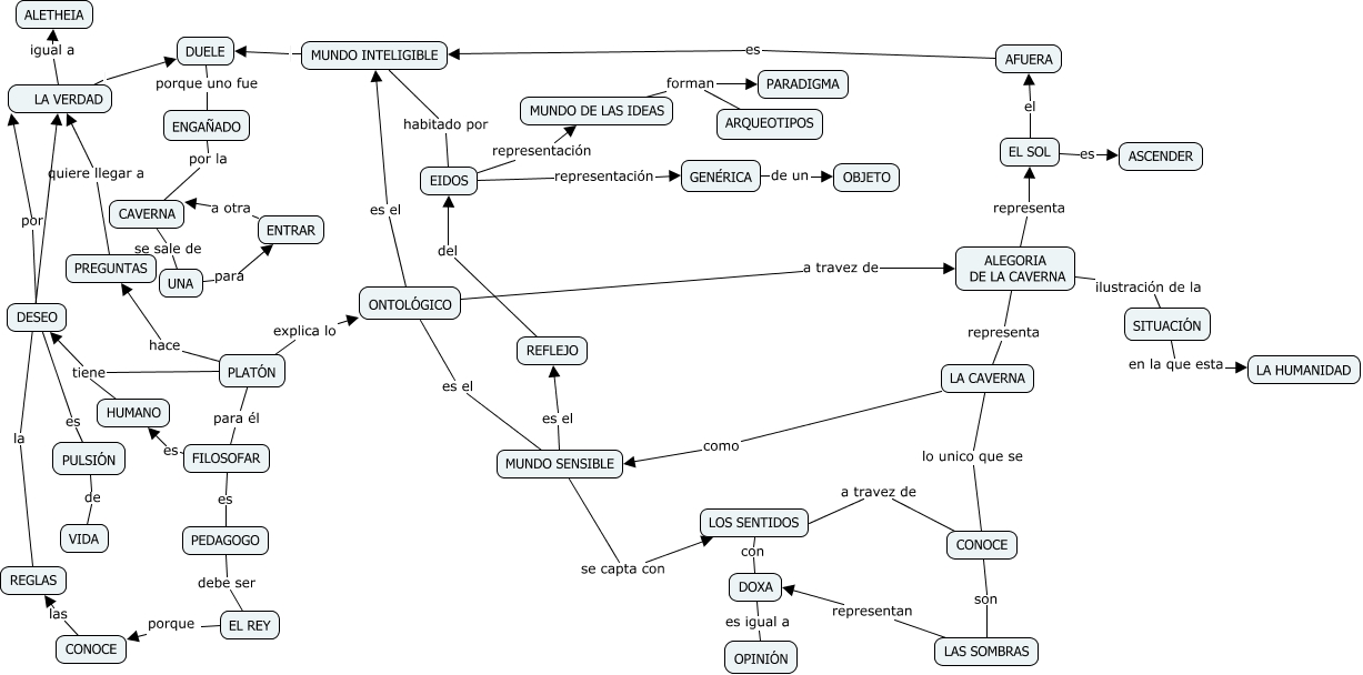 Este Cmap, tiene información relacionada con: PLATON, DESEO por LA VERDAD, ENTRAR a otra CAVERNA, MUNDO SENSIBLE se capta con LOS SENTIDOS, ALEGORIA DE LA CAVERNA representa EL SOL, EL SOL es ASCENDER, DUELE porque uno fue ENGAÑADO, ONTOLÓGICO es el MUNDO INTELIGIBLE, ALEGORIA DE LA CAVERNA representa LA CAVERNA, EIDOS representación GENÉRICA, FILOSOFAR es PEDAGOGO, GENÉRICA de un OBJETO, LA VERDAD DUELE, ENGAÑADO por la CAVERNA, PLATÓN hace PREGUNTAS, MUNDO DE LAS IDEAS forman PARADIGMA, LA CAVERNA lo unico que se CONOCE, MUNDO INTELIGIBLE habitado por EIDOS, EL SOL el AFUERA, LOS SENTIDOS con DOXA, CONOCE a travez de LOS SENTIDOS