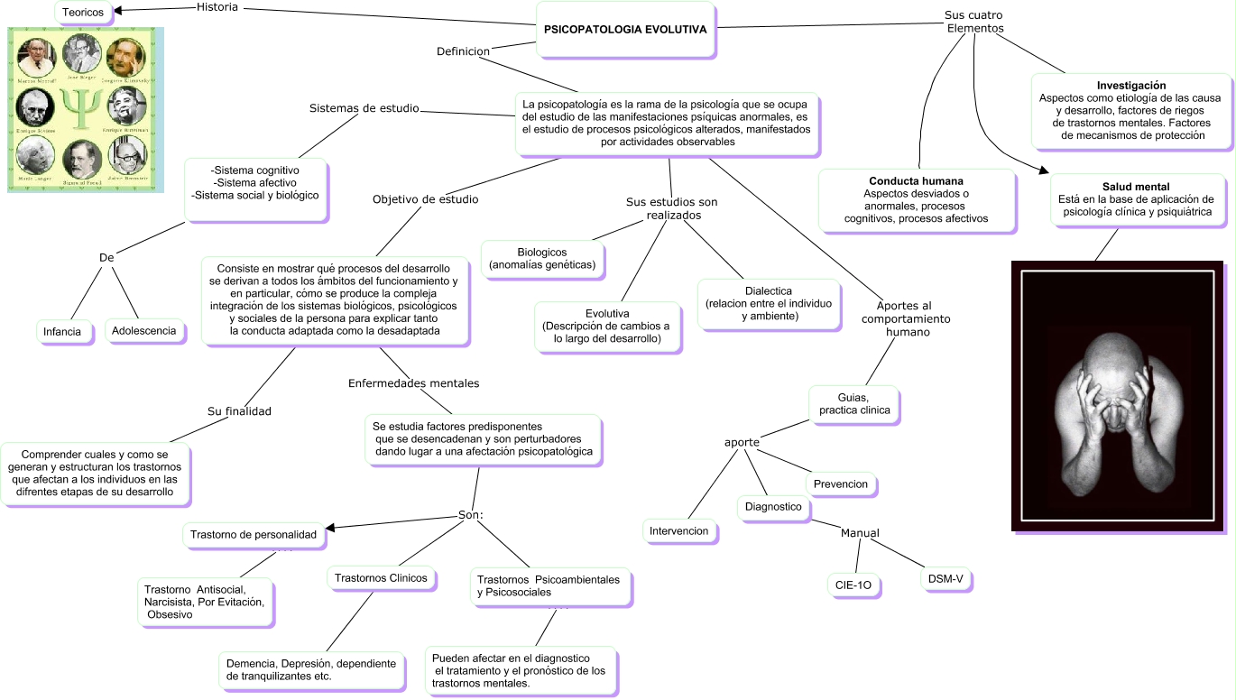 Este Cmap, tiene información relacionada con: Psicopatologia de la infacia y de la adolescencia, Se estudia factores predisponentes que se desencadenan y son perturbadores dando lugar a una afectación psicopatológica Son: Trastornos Clinicos, Trastorno de personalidad ???? Trastorno Antisocial, Narcisista, Por Evitación, Obsesivo, La psicopatología es la rama de la psicología que se ocupa del estudio de las manifestaciones psíquicas anormales, es el estudio de procesos psicológicos alterados, manifestados por actividades observables Sus estudios son realizados Biologicos (anomalías genéticas), Salud mental Está en la base de aplicación de psicología clínica y psiquiátrica ????, Se estudia factores predisponentes que se desencadenan y son perturbadores dando lugar a una afectación psicopatológica Son: Trastorno de personalidad, Guias, practica clinica aporte Intervencion, Trastornos Clinicos ???? Demencia, Depresión, dependiente de tranquilizantes etc., Consiste en mostrar qué procesos del desarrollo se derivan a todos los ámbitos del funcionamiento y en particular, cómo se produce la compleja integración de los sistemas biológicos, psicológicos y sociales de la persona para explicar tanto la conducta adaptada como la desadaptada Enfermedades mentales Se estudia factores predisponentes que se desencadenan y son perturbadores dando lugar a una afectación psicopatológica, La psicopatología es la rama de la psicología que se ocupa del estudio de las manifestaciones psíquicas anormales, es el estudio de procesos psicológicos alterados, manifestados por actividades observables Objetivo de estudio Consiste en mostrar qué procesos del desarrollo se derivan a todos los ámbitos del funcionamiento y en particular, cómo se produce la compleja integración de los sistemas biológicos, psicológicos y sociales de la persona para explicar tanto la conducta adaptada como la desadaptada, PSICOPATOLOGIA EVOLUTIVA Historia Teoricos, Se estudia factores predisponentes que se desencadenan y son perturbadores dando lugar a una afectación psicopatológica Son: Trastornos Psicoambientales y Psicosociales, Guias, practica clinica aporte Prevencion, Diagnostico Manual DSM-V, PSICOPATOLOGIA EVOLUTIVA Definicion La psicopatología es la rama de la psicología que se ocupa del estudio de las manifestaciones psíquicas anormales, es el estudio de procesos psicológicos alterados, manifestados por actividades observables, La psicopatología es la rama de la psicología que se ocupa del estudio de las manifestaciones psíquicas anormales, es el estudio de procesos psicológicos alterados, manifestados por actividades observables Sus estudios son realizados Evolutiva (Descripción de cambios a lo largo del desarrollo), Guias, practica clinica aporte Diagnostico, -Sistema cognitivo -Sistema afectivo -Sistema social y biológico De Adolescencia, -Sistema cognitivo -Sistema afectivo -Sistema social y biológico De Infancia, La psicopatología es la rama de la psicología que se ocupa del estudio de las manifestaciones psíquicas anormales, es el estudio de procesos psicológicos alterados, manifestados por actividades observables Aportes al comportamiento humano Guias, practica clinica, La psicopatología es la rama de la psicología que se ocupa del estudio de las manifestaciones psíquicas anormales, es el estudio de procesos psicológicos alterados, manifestados por actividades observables Sus estudios son realizados Dialectica (relacion entre el individuo y ambiente)
