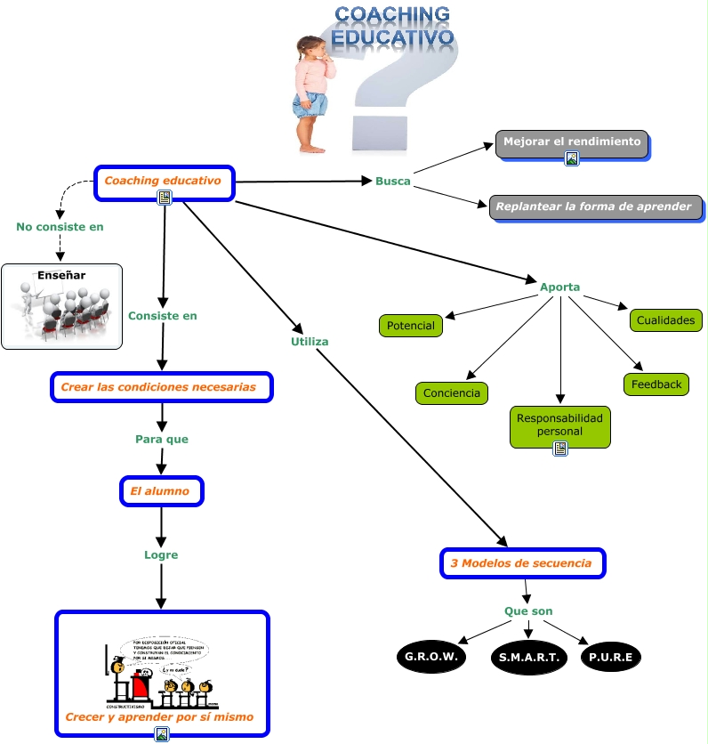 Este Cmap, tiene información relacionada con: Coaching educativo, Coaching educativo Aporta Potencial, Coaching educativo Aporta Responsabilidad personal, El alumno Logre Crecer y aprender por sí mismo, 3 Modelos de secuencia Que son G.R.O.W., Coaching educativo Aporta Cualidades, Coaching educativo Aporta Feedback, 3 Modelos de secuencia Que son P.U.R.E, Coaching educativo No consiste en Enseñar, Coaching educativo Utiliza 3 Modelos de secuencia, Coaching educativo Busca Mejorar el rendimiento, Coaching educativo Aporta Conciencia, Coaching educativo Consiste en Crear las condiciones necesarias, 3 Modelos de secuencia Que son S.M.A.R.T., Crear las condiciones necesarias Para que El alumno, Coaching educativo Busca Replantear la forma de aprender